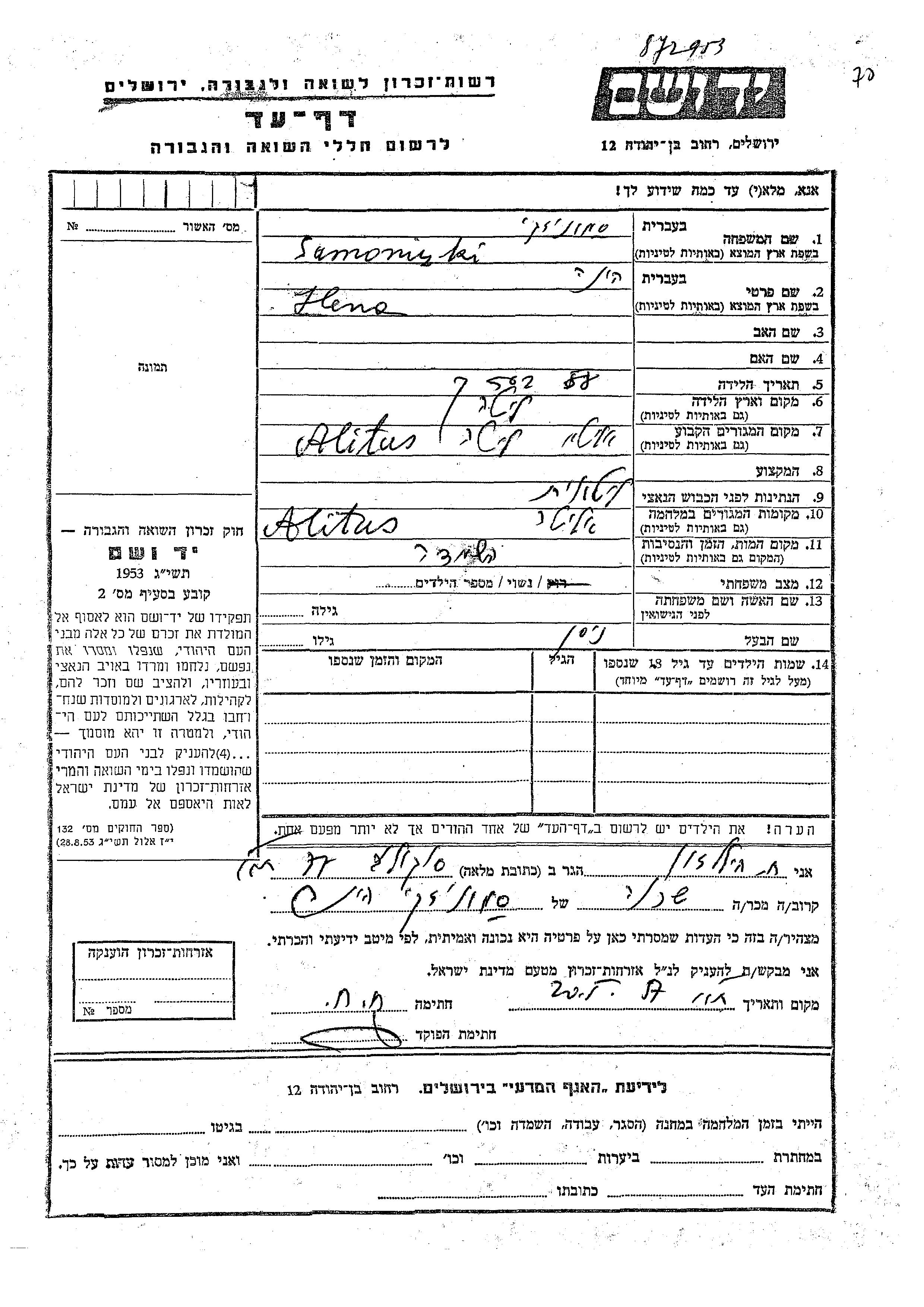Хина Самонизки, место рождения: Литва. Женат / замужем. Место жительства до войны: Алитус, Литва. Место во время войны: Алитус, Литва.