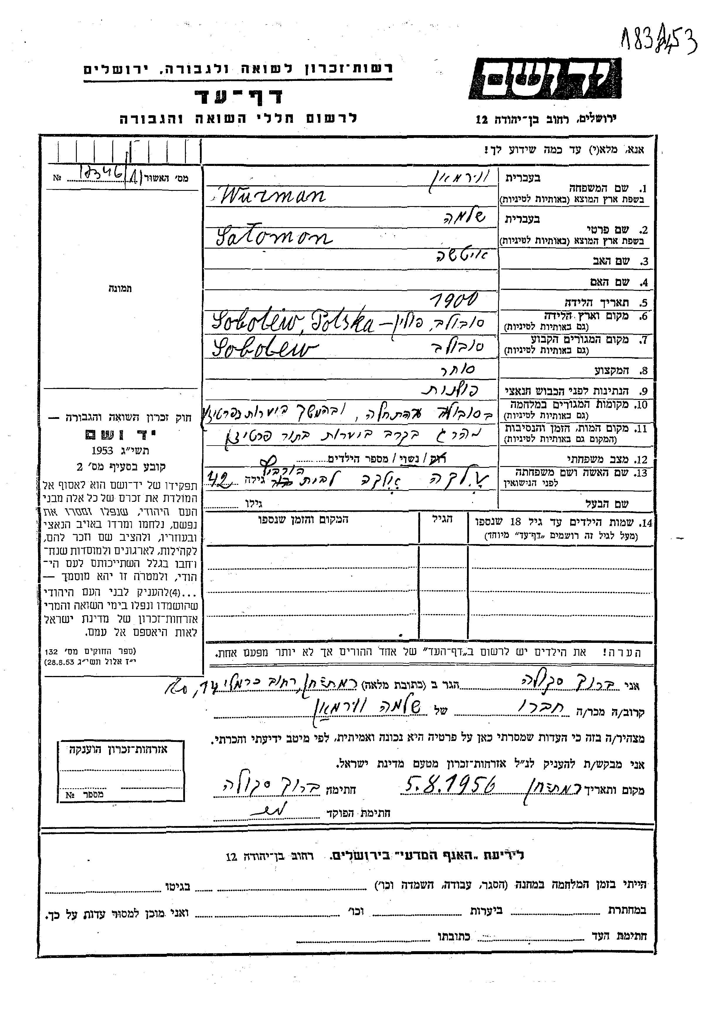 Саломон Вурман Ворман, место рождения: Соболев, Польша. Отец: Иче. Торговец / торговка. Женат / замужем. Место жительства до войны: Соболев, Польша. Место во время войны: Соболев, Польша.