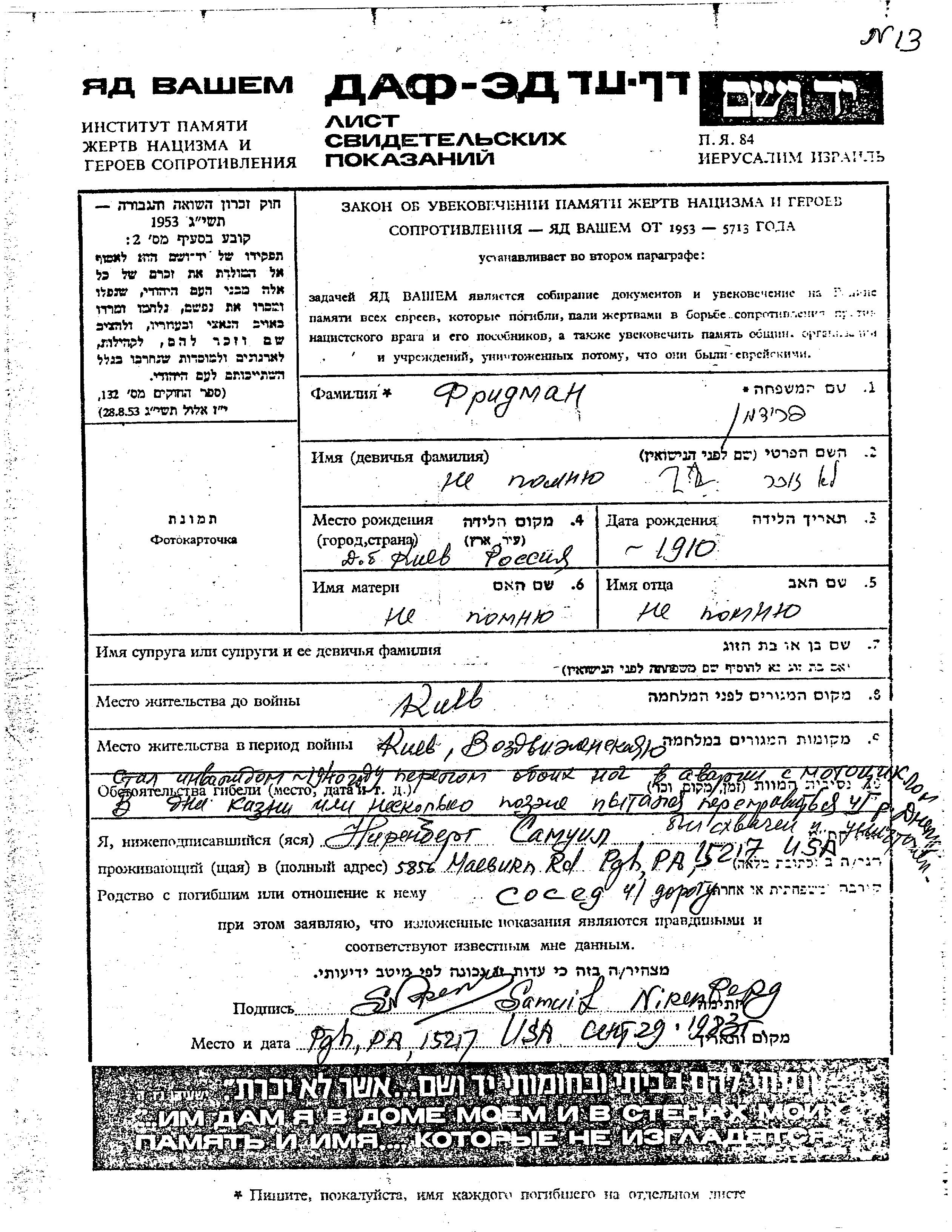 Фридман Имя неизвестно 1910 Киев, Украина (СССР) Лист свидетельских показаний