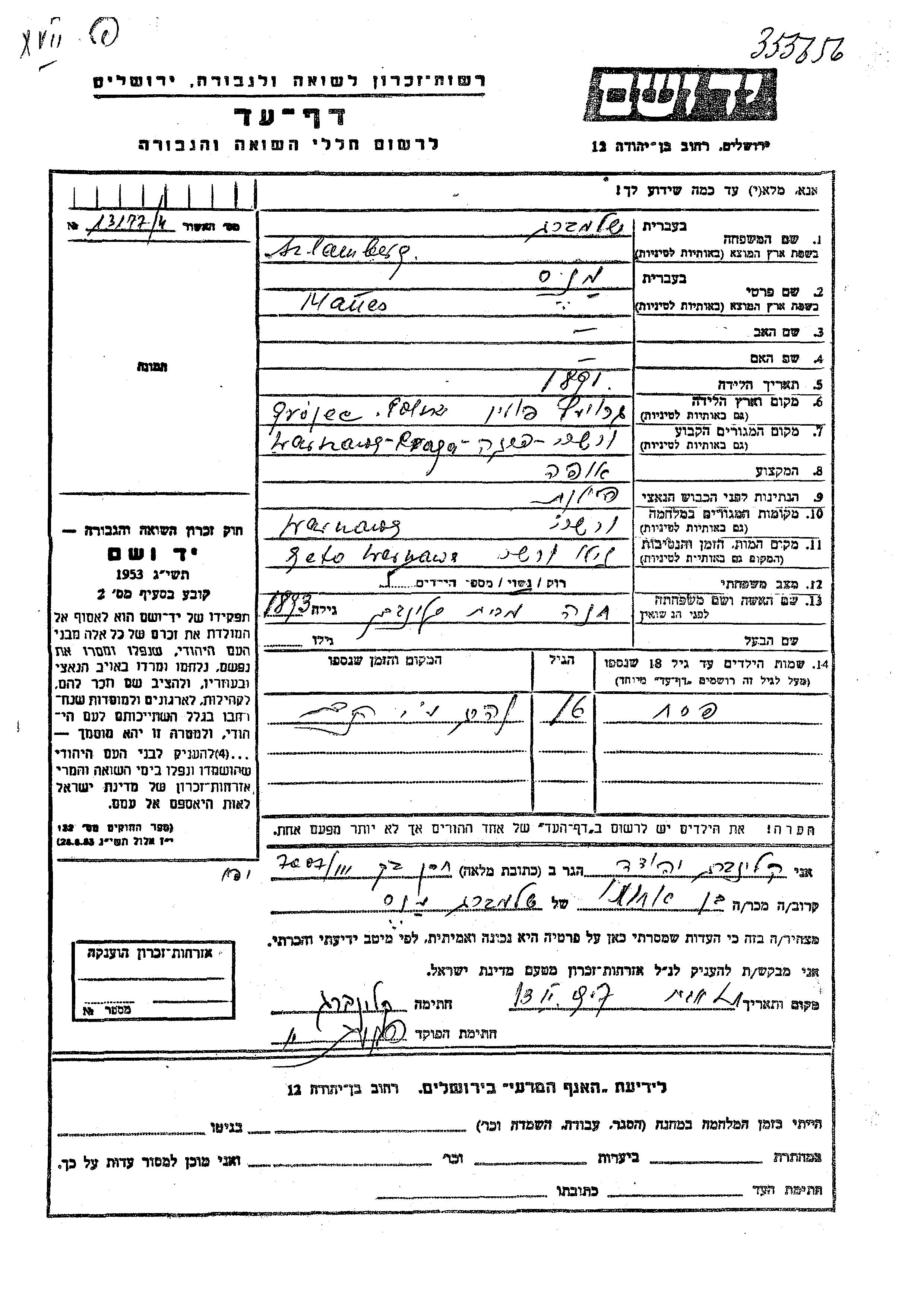 Манес Шламберг, место рождения: Груец, Польша. Пекарь. Женат / замужем. Место жительства до войны: Прага, Польша. Место во время войны: Варшава, Польша.