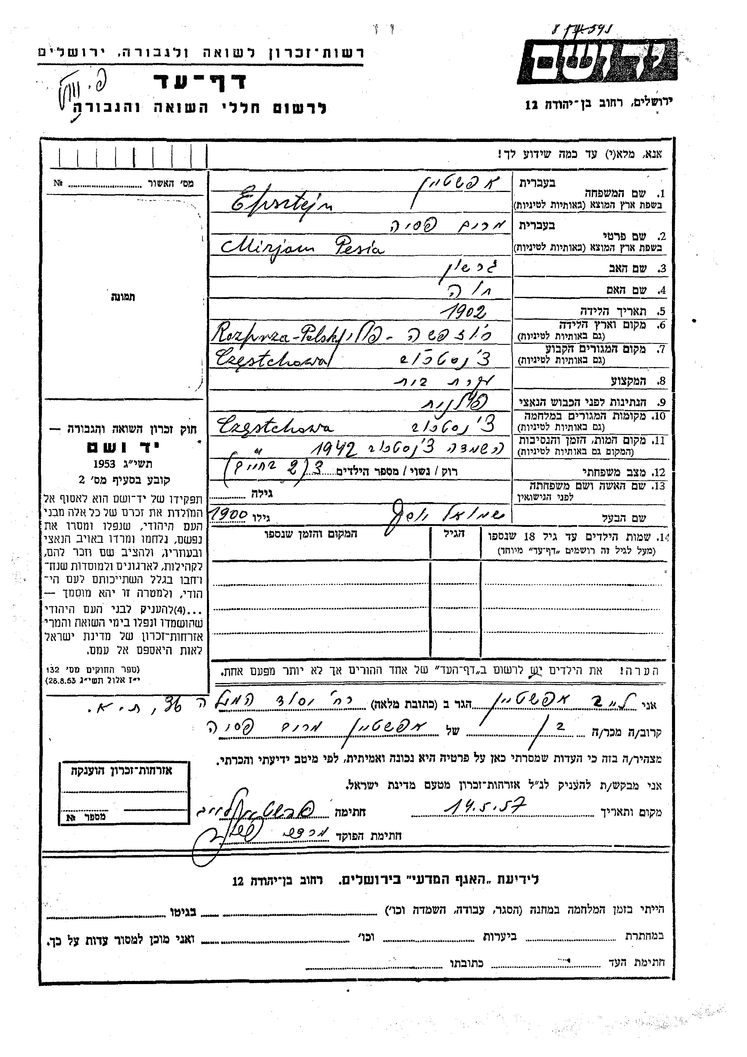 Мирьям Песя Эпштейн, место рождения: Розпша, Польша. Отец: Гершон, mать:Хава. Домохозяйка. Женат / замужем. Место жительства до войны: Ченстохов, Польша. Место во время войны: Ченстохов, Польша.