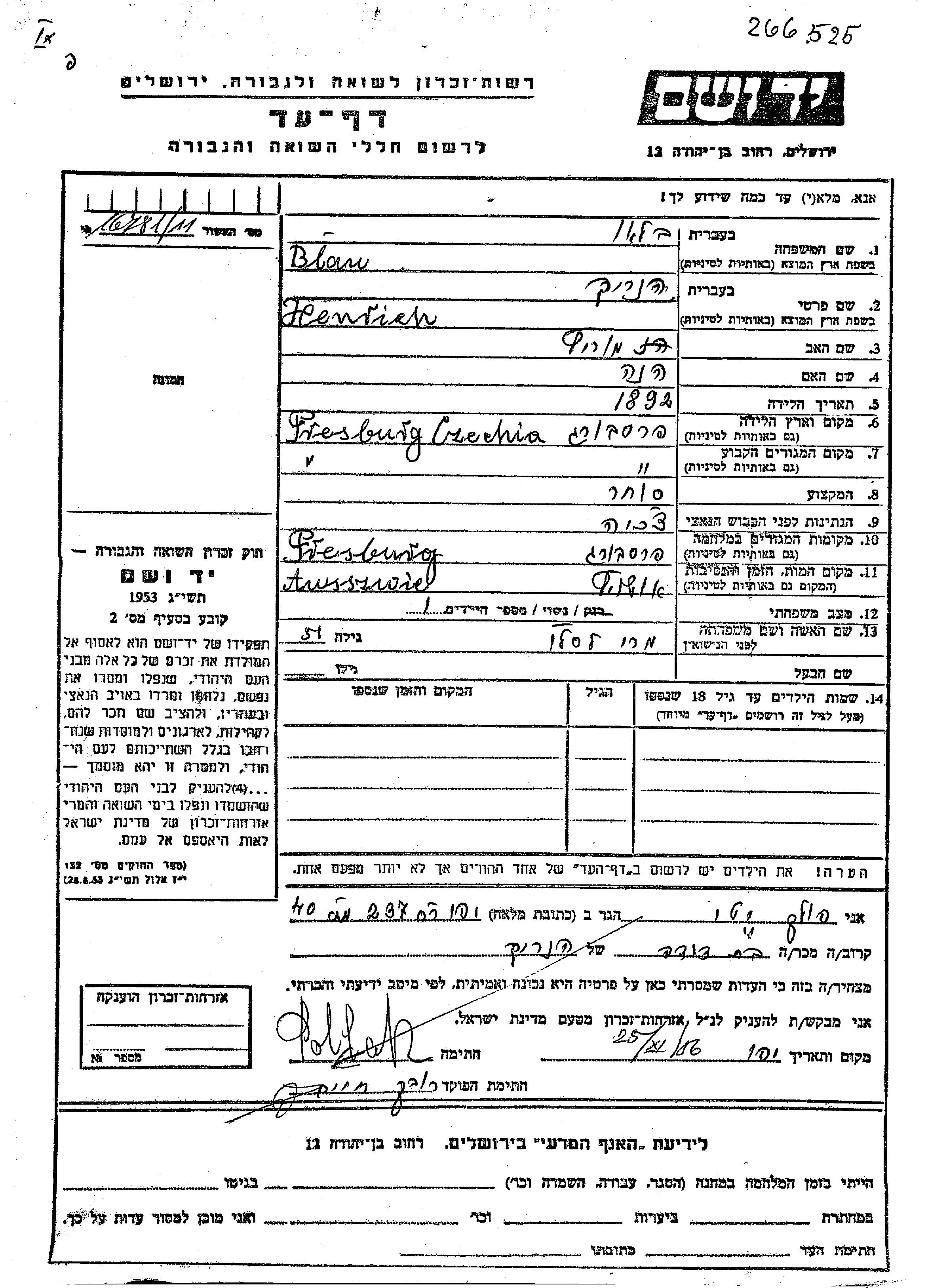 Хенрих Блау, место рождения: Пресбург, Чехословакия. Отец: Мориц, mать:Хена. Торговец / торговка. Женат / замужем. Место жительства до войны: Пресбург, Чехословакия. Место во время войны: Пресбург, Чехословакия.
