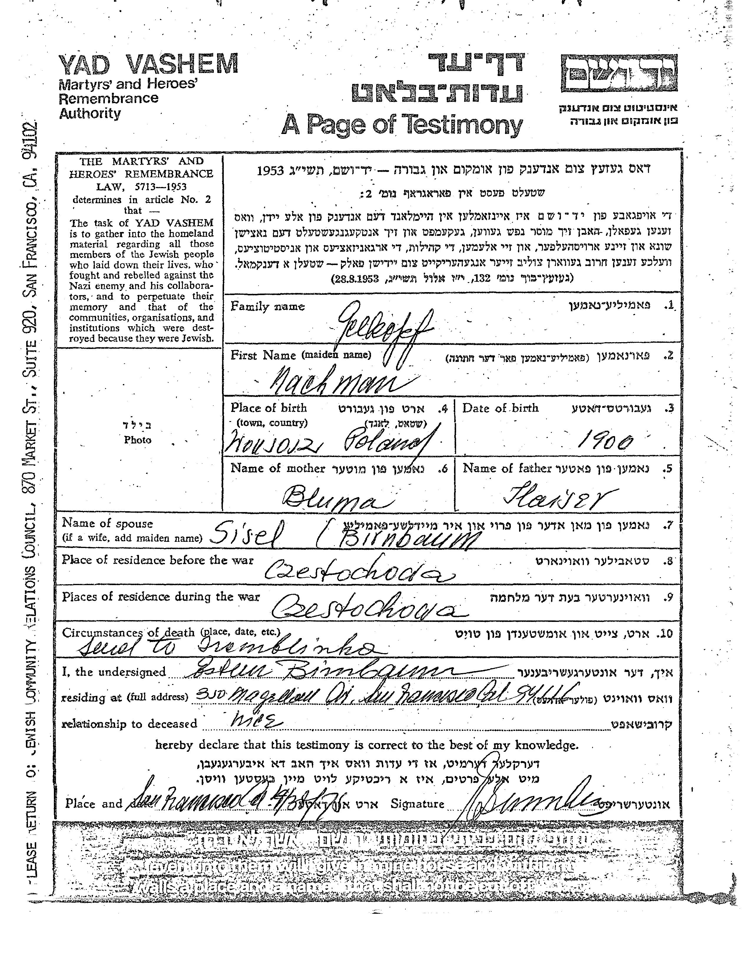 Гелькопф Нахман 1900 Ченстохова, Польша Лист свидетельских показаний