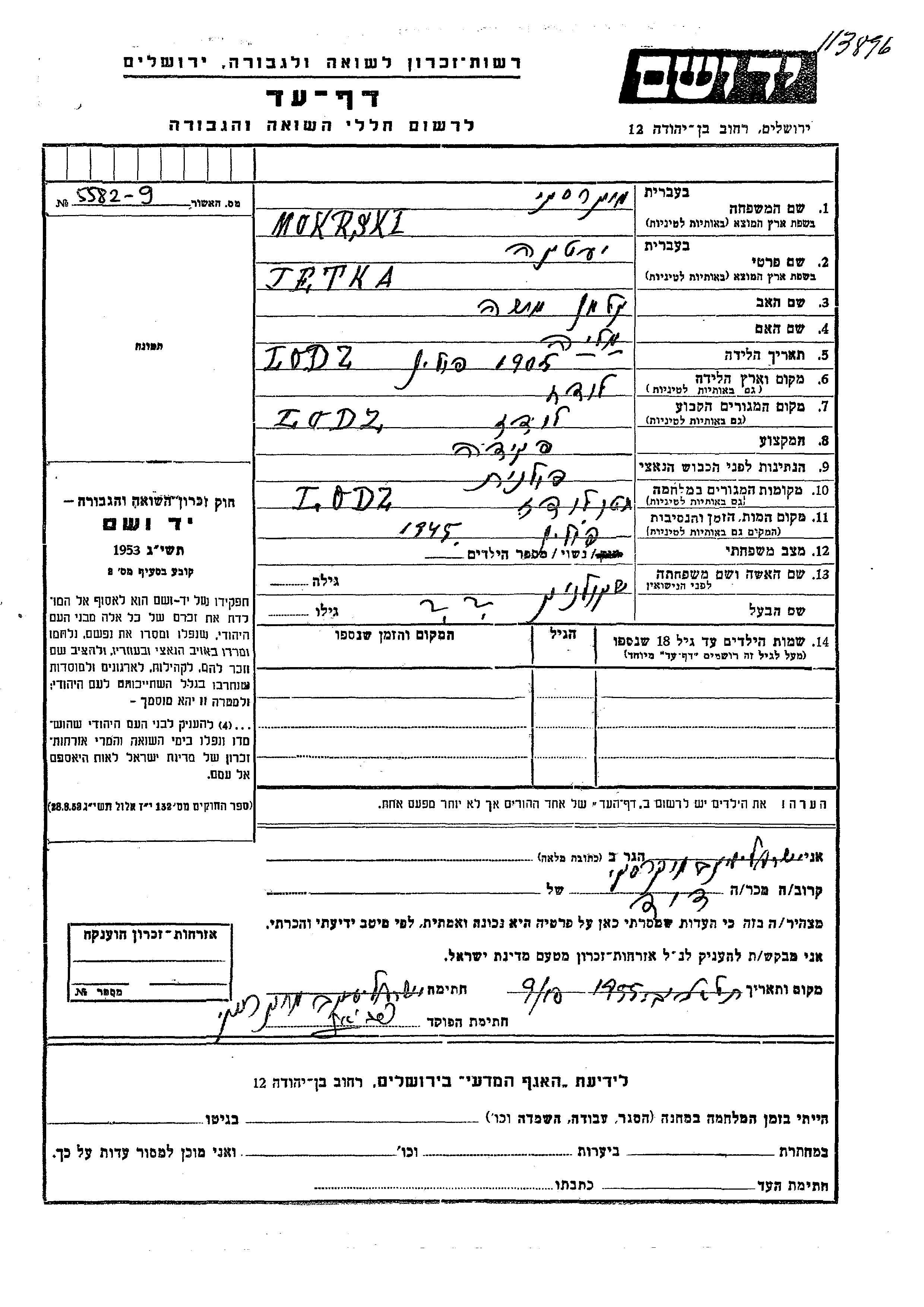 Етка Мокрски, девичья фамилия Школьник, место рождения: Лодзь, Польша. Отец: Кальман Миша, mать:Малия. Клерк. Женат / замужем. Место жительства до войны: Лодзь, Польша. Место во время войны: Лодзь, Польша.