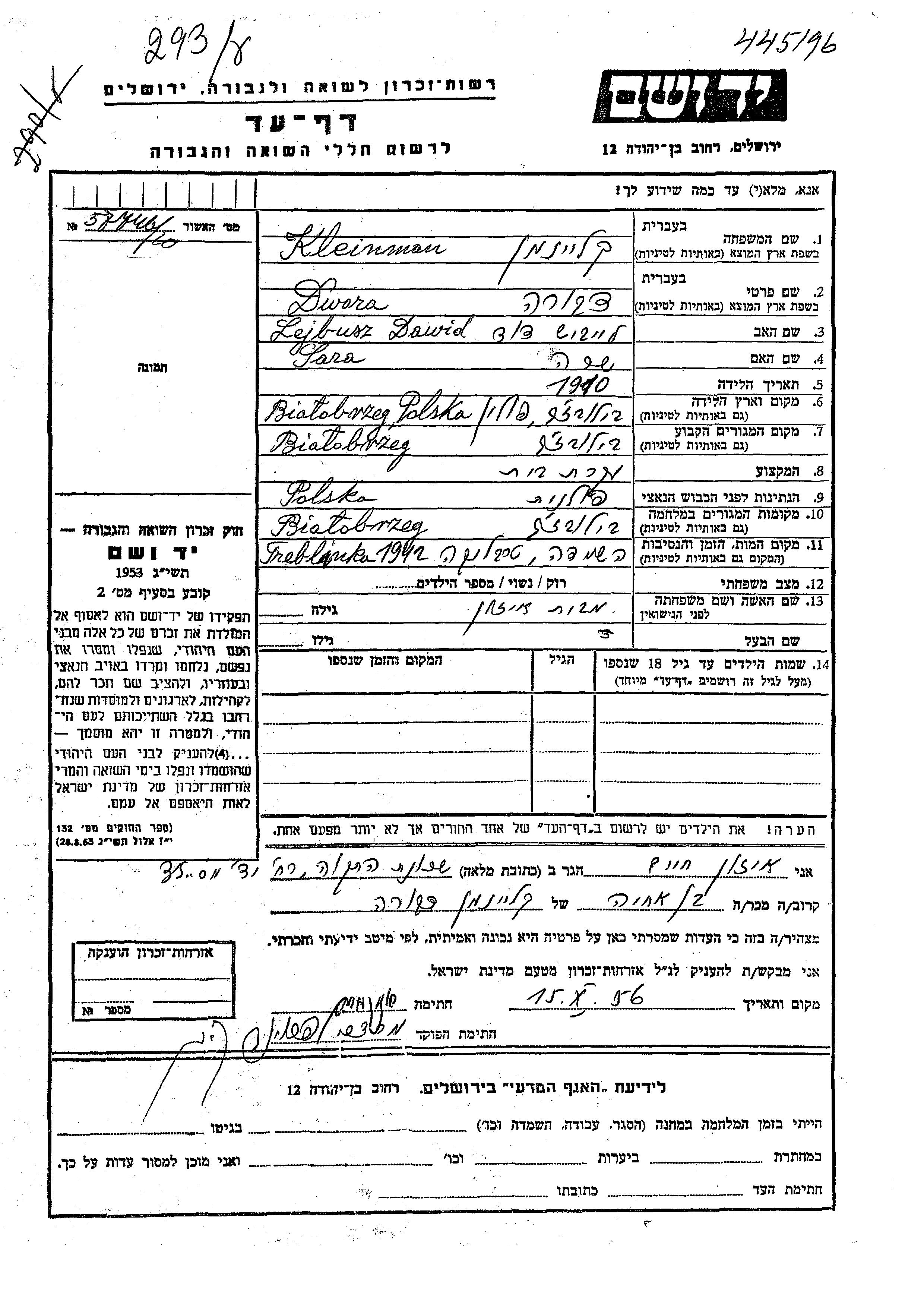 Клейнман Двора 1910 Бялобжеги, Польша Лист свидетельских показаний