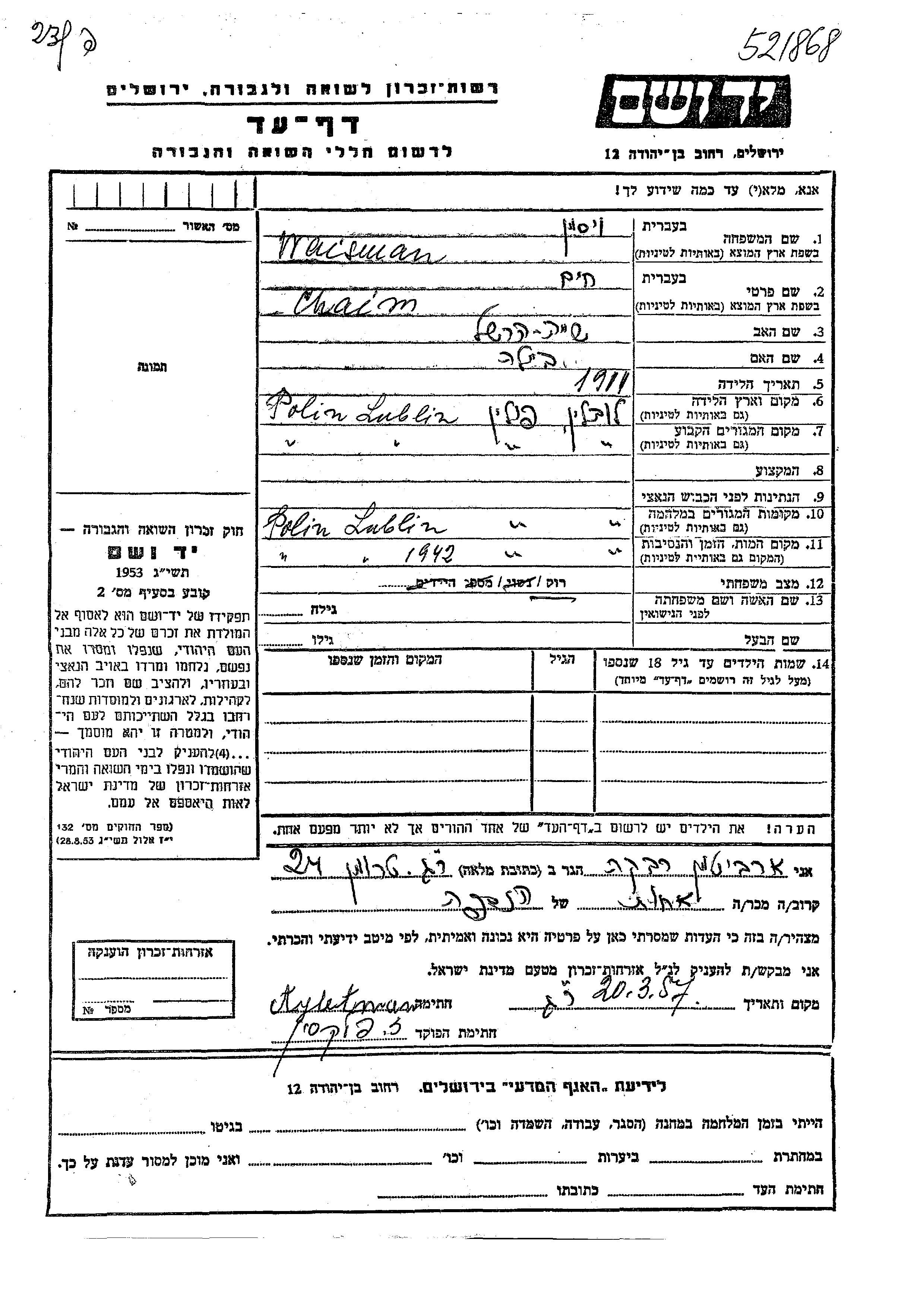 Вайсман Хаим 1911 Люблин, Польша Лист свидетельских показаний