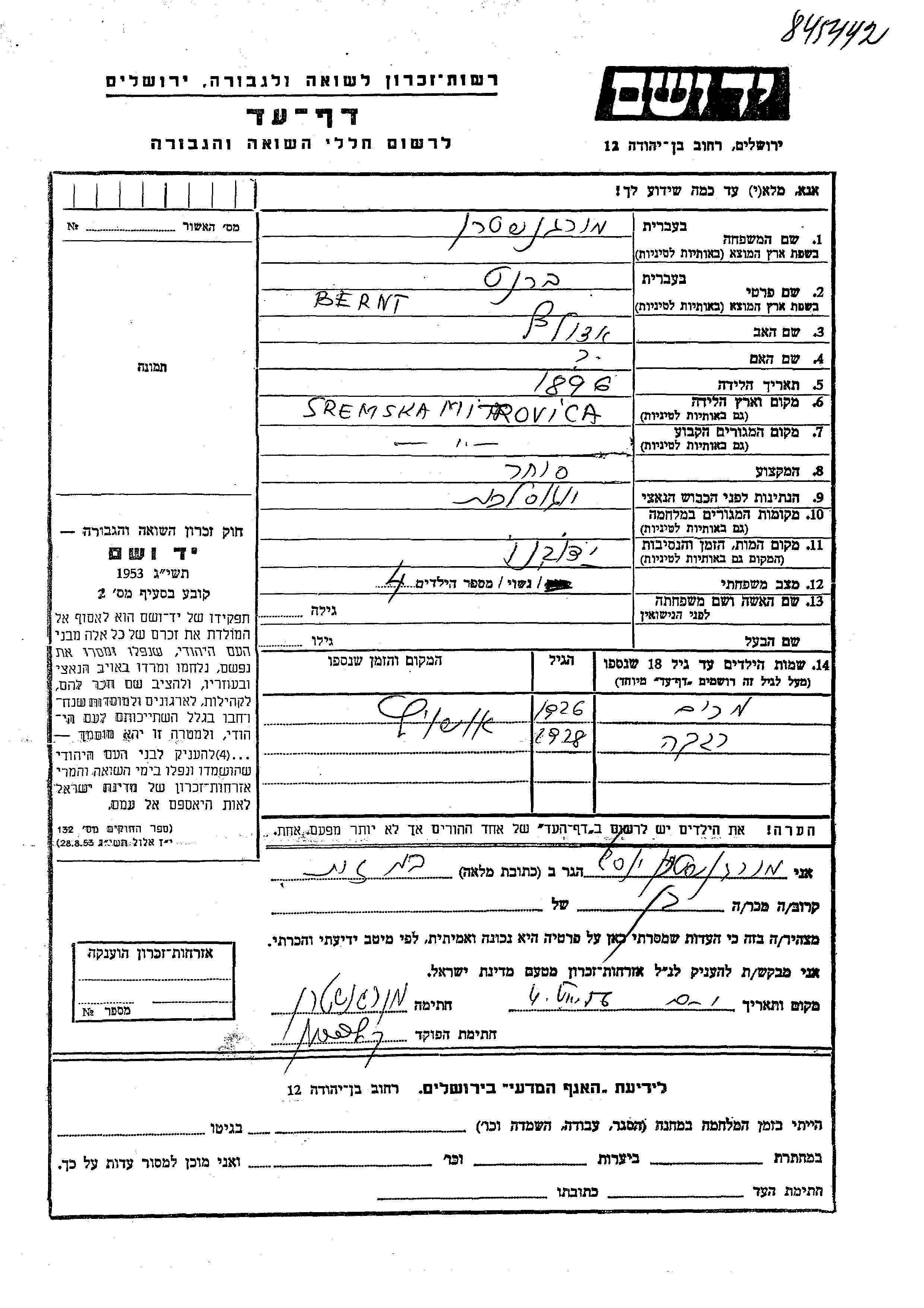 Моргенштерн Бернт 1896 Сремска-Митровица, Югославия Лист свидетельских показаний