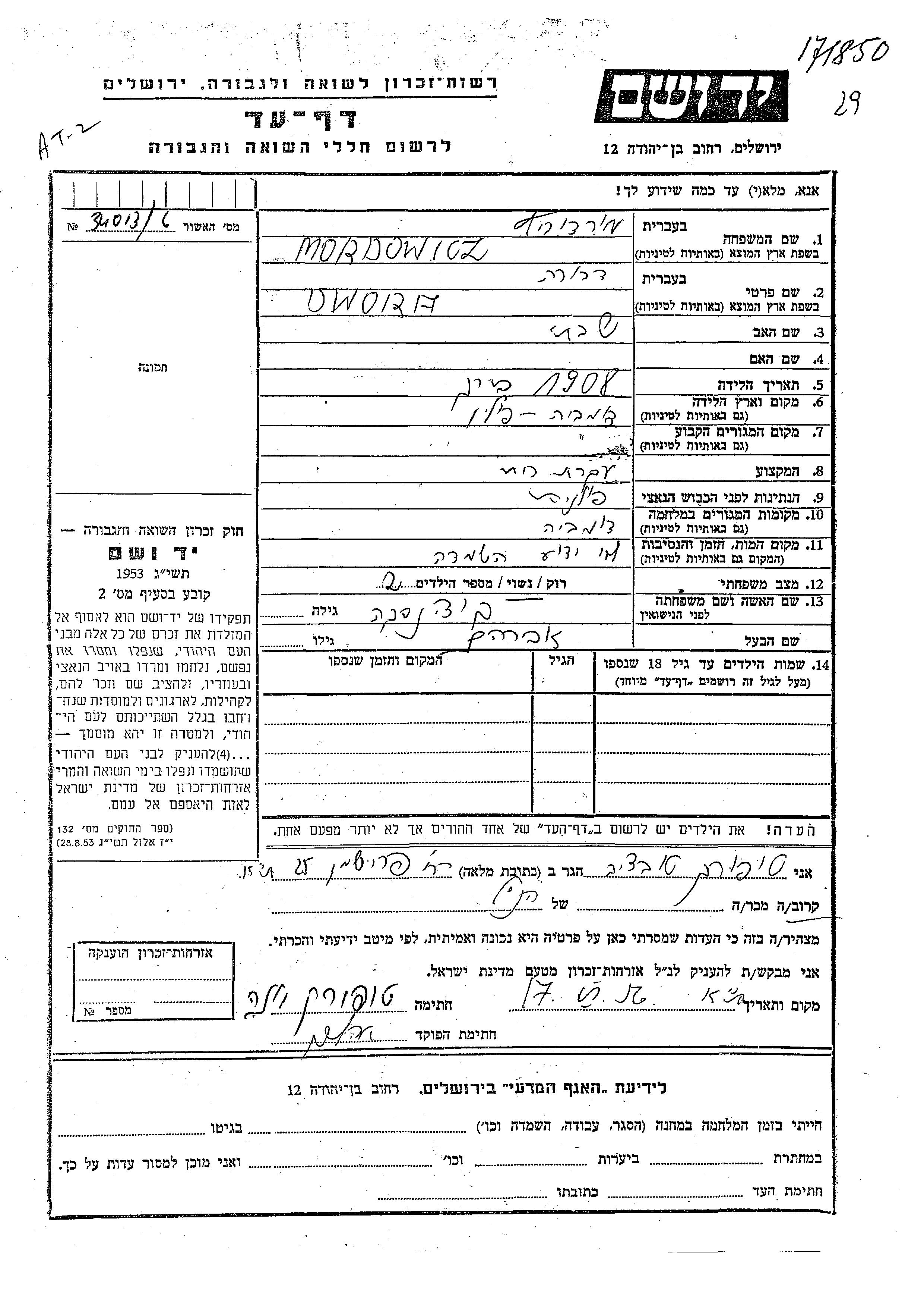 Двора Мордович, девичья фамилия Кучински, место рождения: Домбя, Польша. Отец: Шабтай. Домохозяйка. Женат / замужем. Место жительства до войны: Домбя, Польша. Место во время войны: Домбя, Польша.