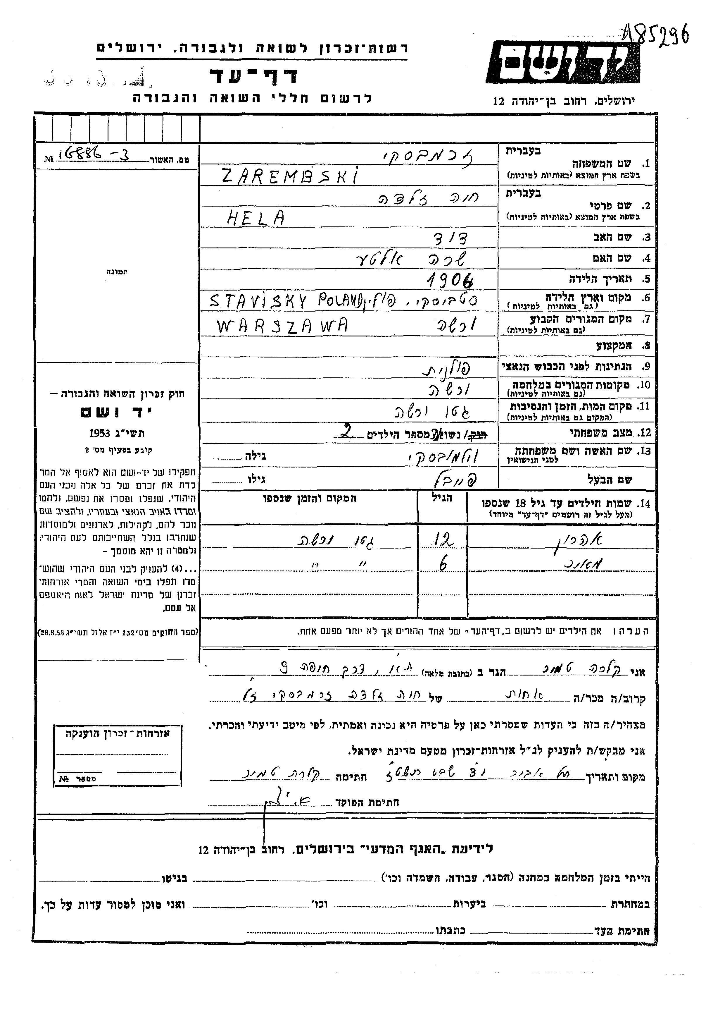 Хела Хая Зельда Зарембски, девичья фамилия Виламовский, место рождения: Стависки, Польша. Отец: Давид, mать:Сара Алте. Женат / замужем. Место жительства до войны: Варшава, Польша. Место во время войны: Варшава, Польша.