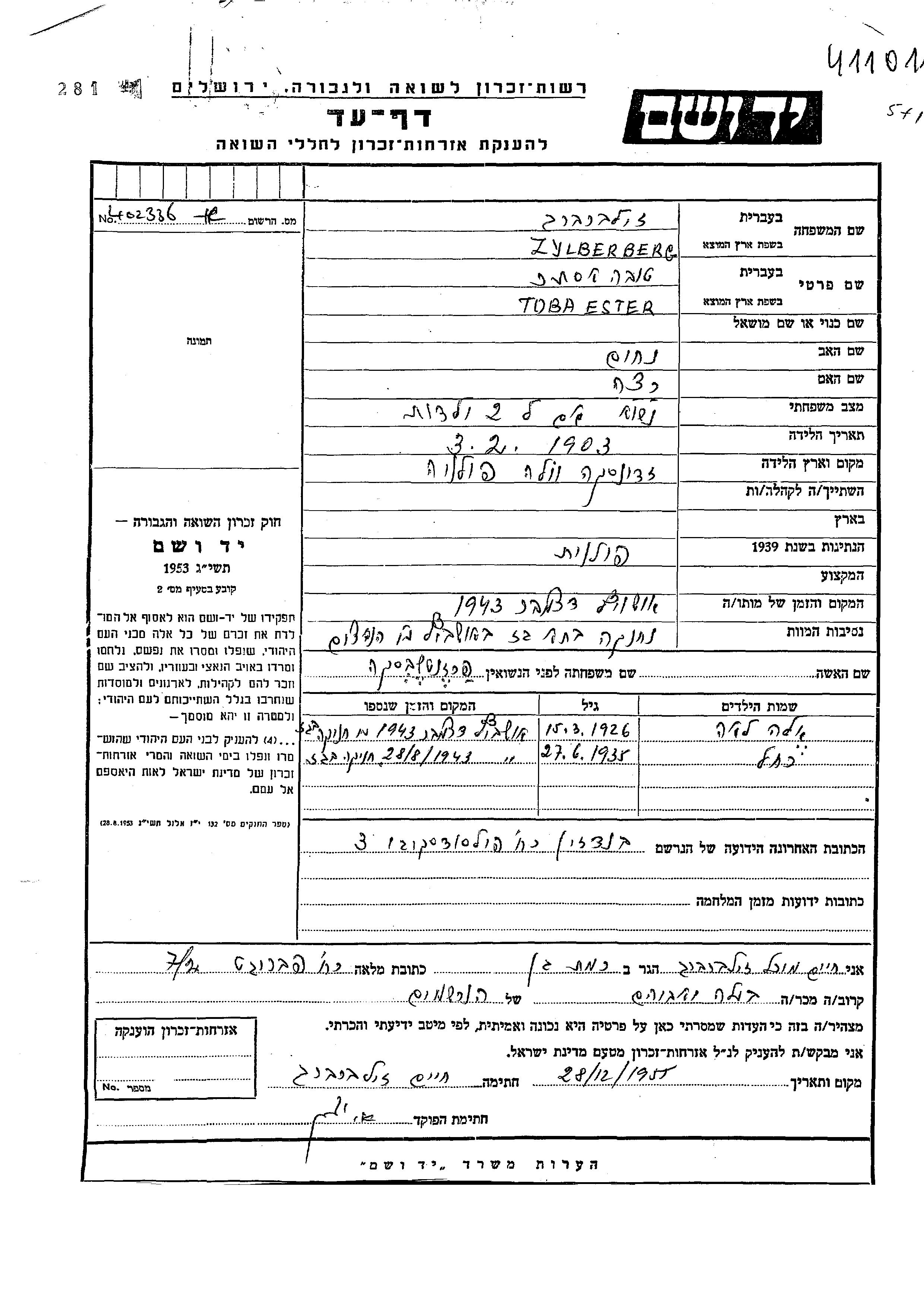 Тоба Това Эстер Зильберберг, место рождения: Здуньска-Воля, Польша. Отец: Нахум, mать:Раца. Женат / замужем. Место во время войны: Бендзин, Польша.