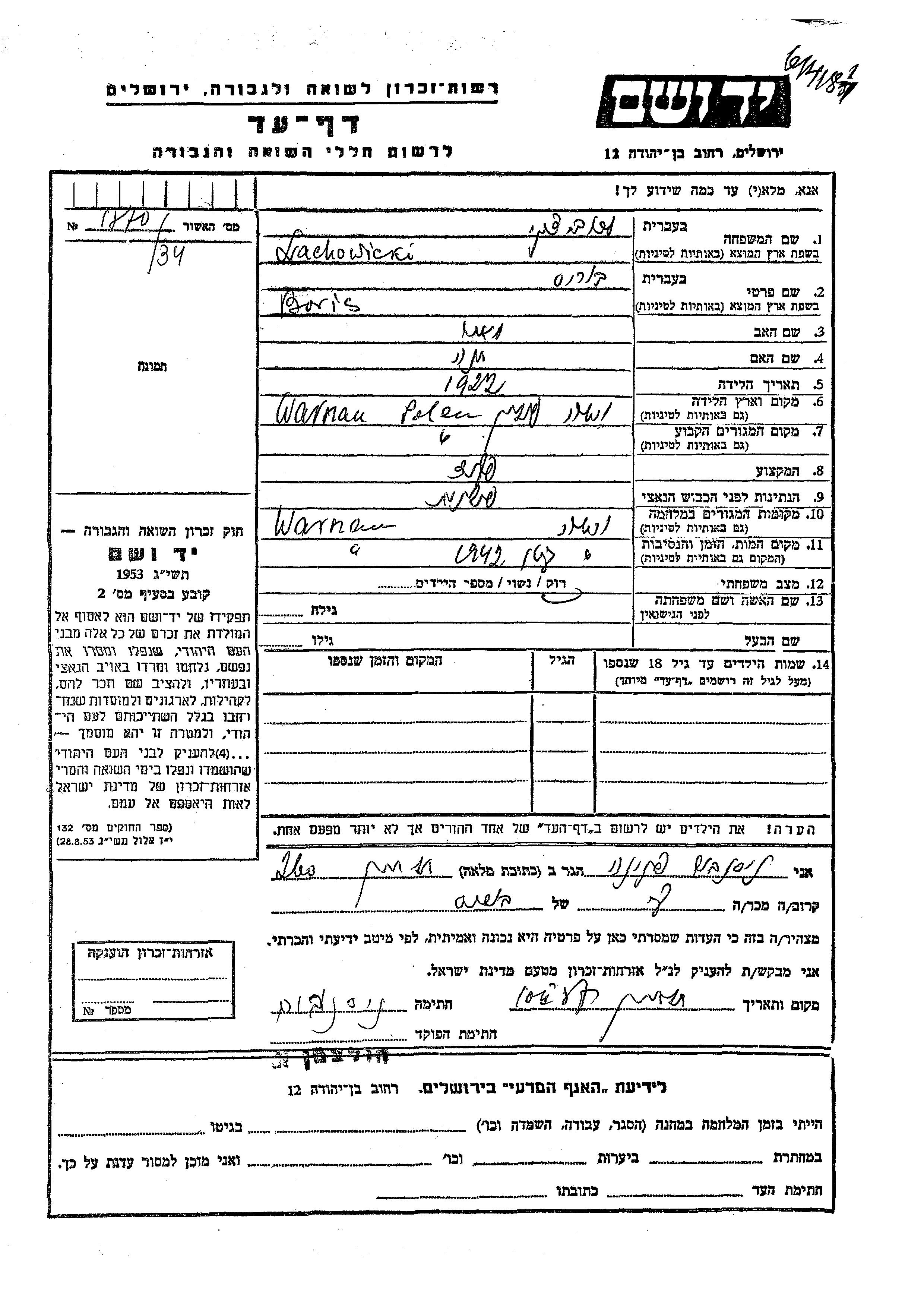Ляховицки Борис 1922 Варшава, Польша Лист свидетельских показаний