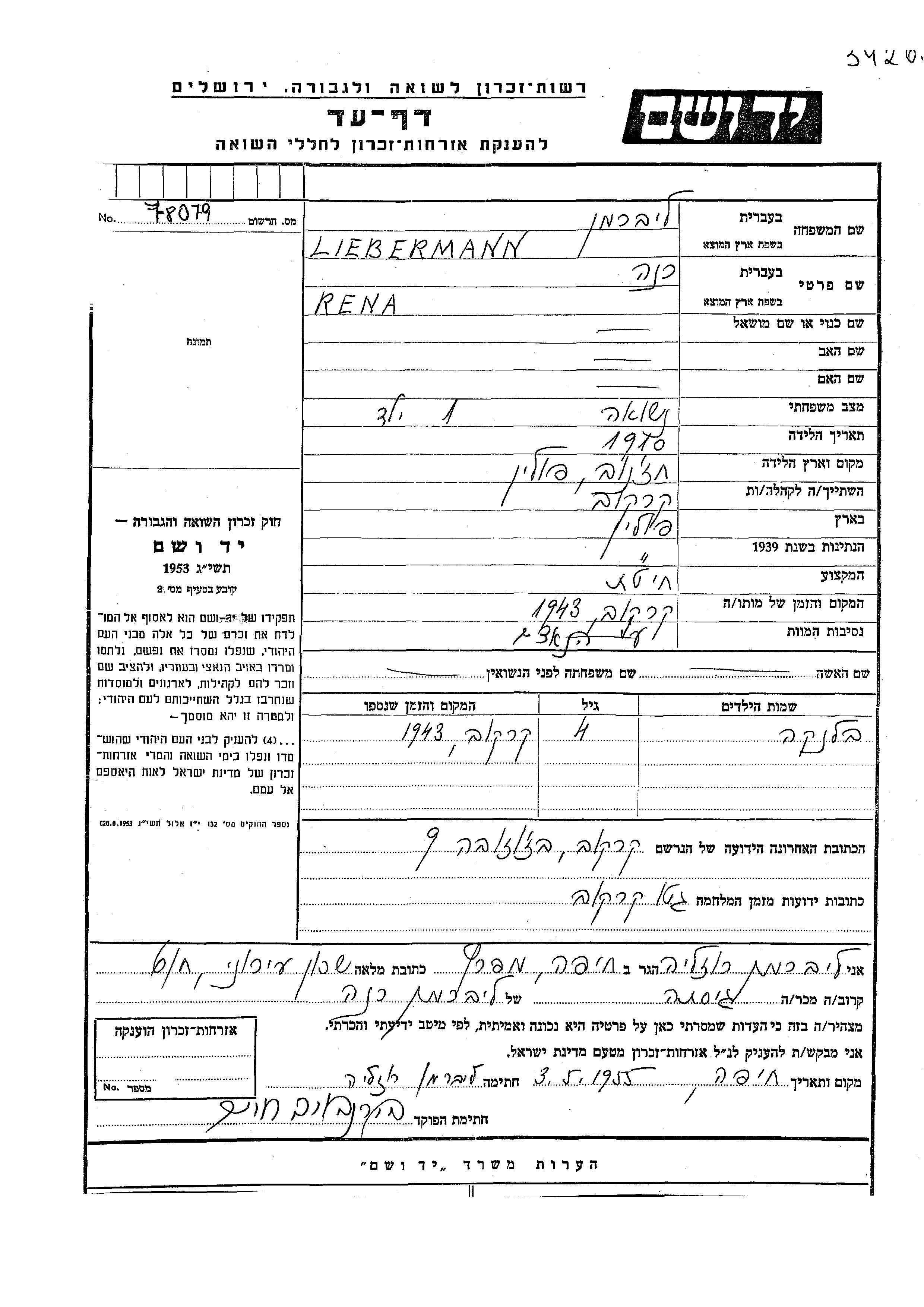 Либерман Рена Рене 1910 Краков, Польша Лист свидетельских показаний