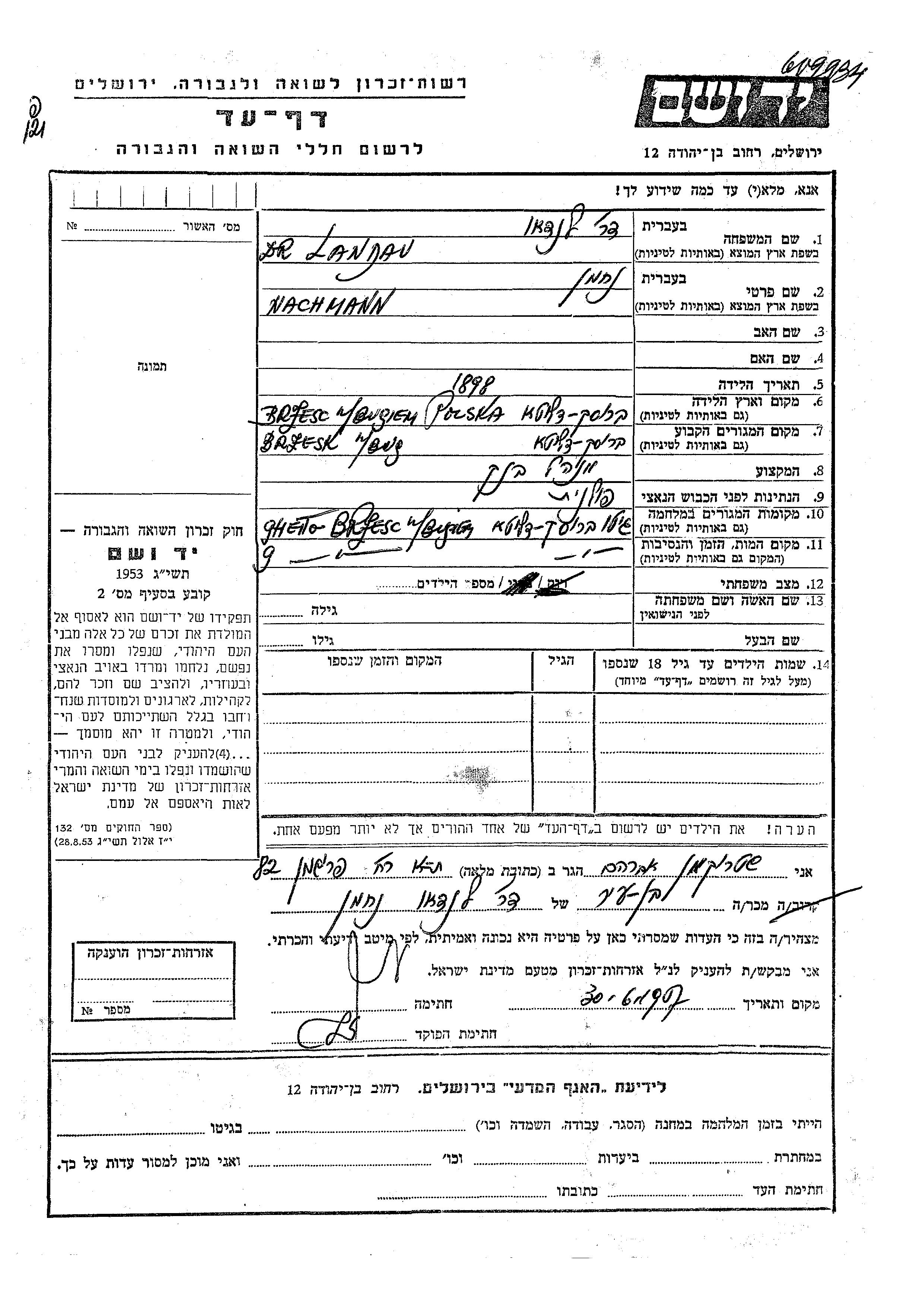 Др. Нахманн Ландау, место рождения: Брест, Польша. Заведующий банком. Холост / не замужем. Место жительства до войны: Брест, Польша. Место во время войны: Брест Над Бугом, Польша.