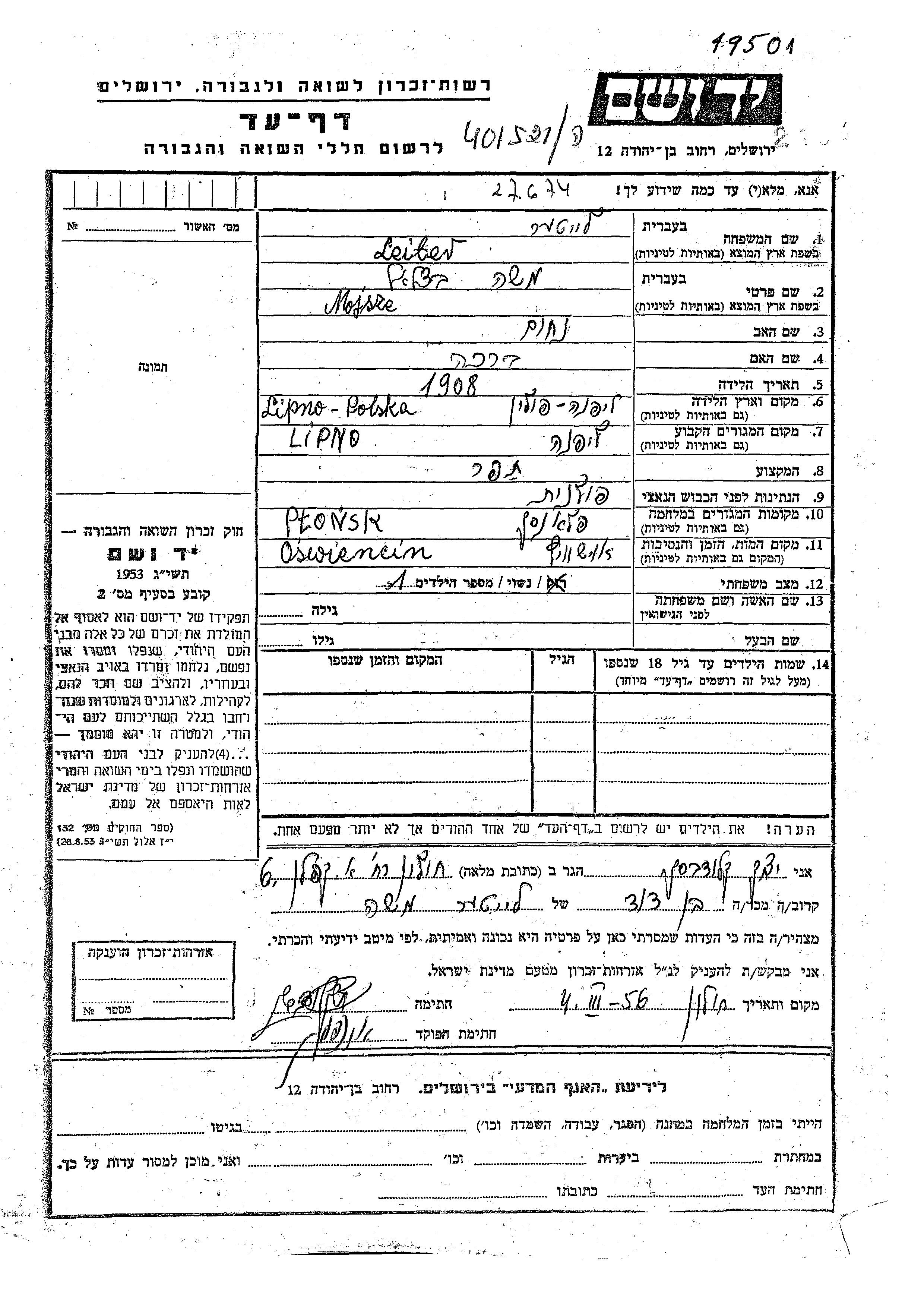Лайтер Мойше Бецалель 1908 Липно, Польша Лист свидетельских показаний