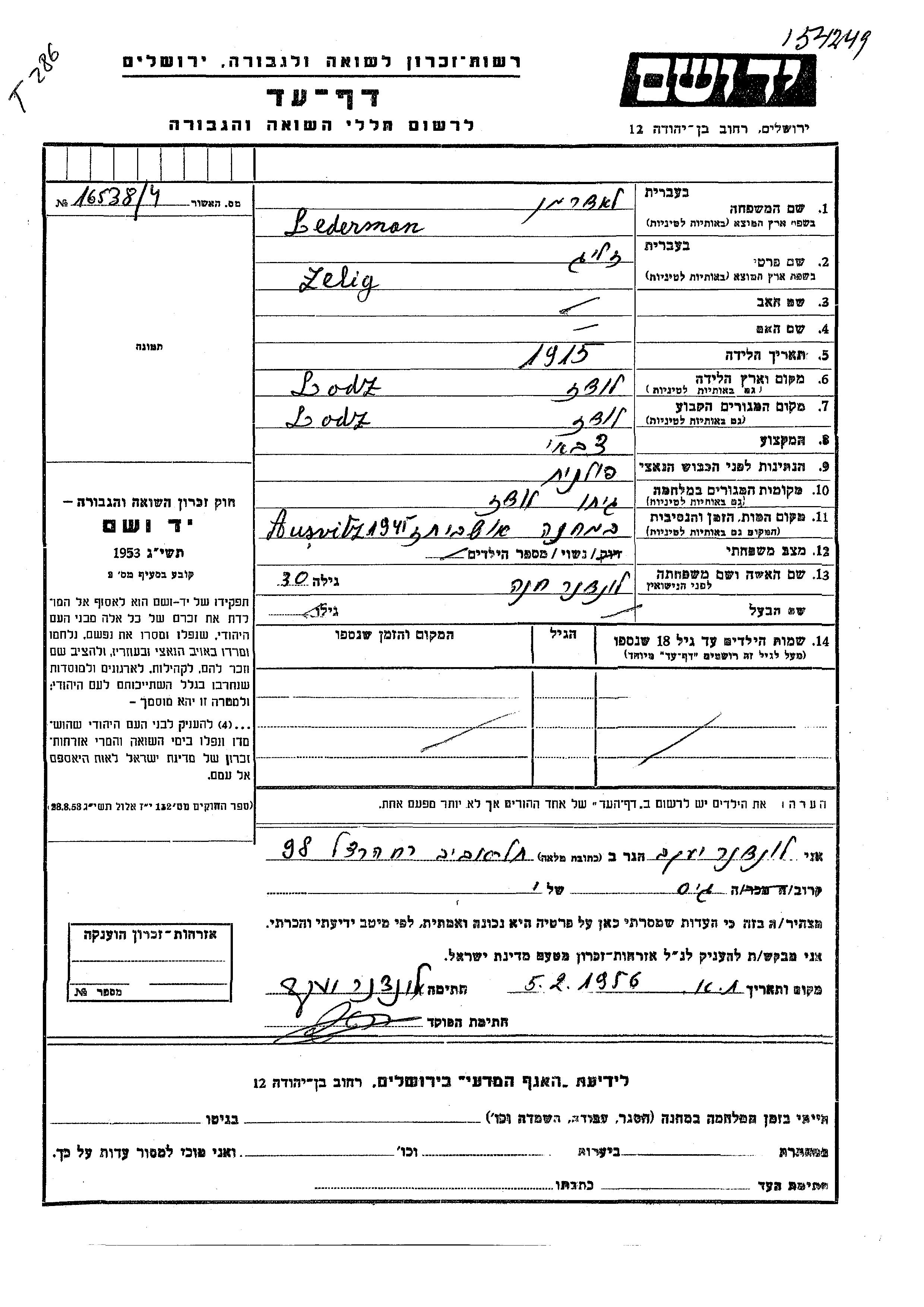 Зелиг Ледерман, место рождения: Лодзь, Польша. Маляр. Женат / замужем. Место жительства до войны: Лодзь, Польша. Место во время войны: Лодзь, Польша.