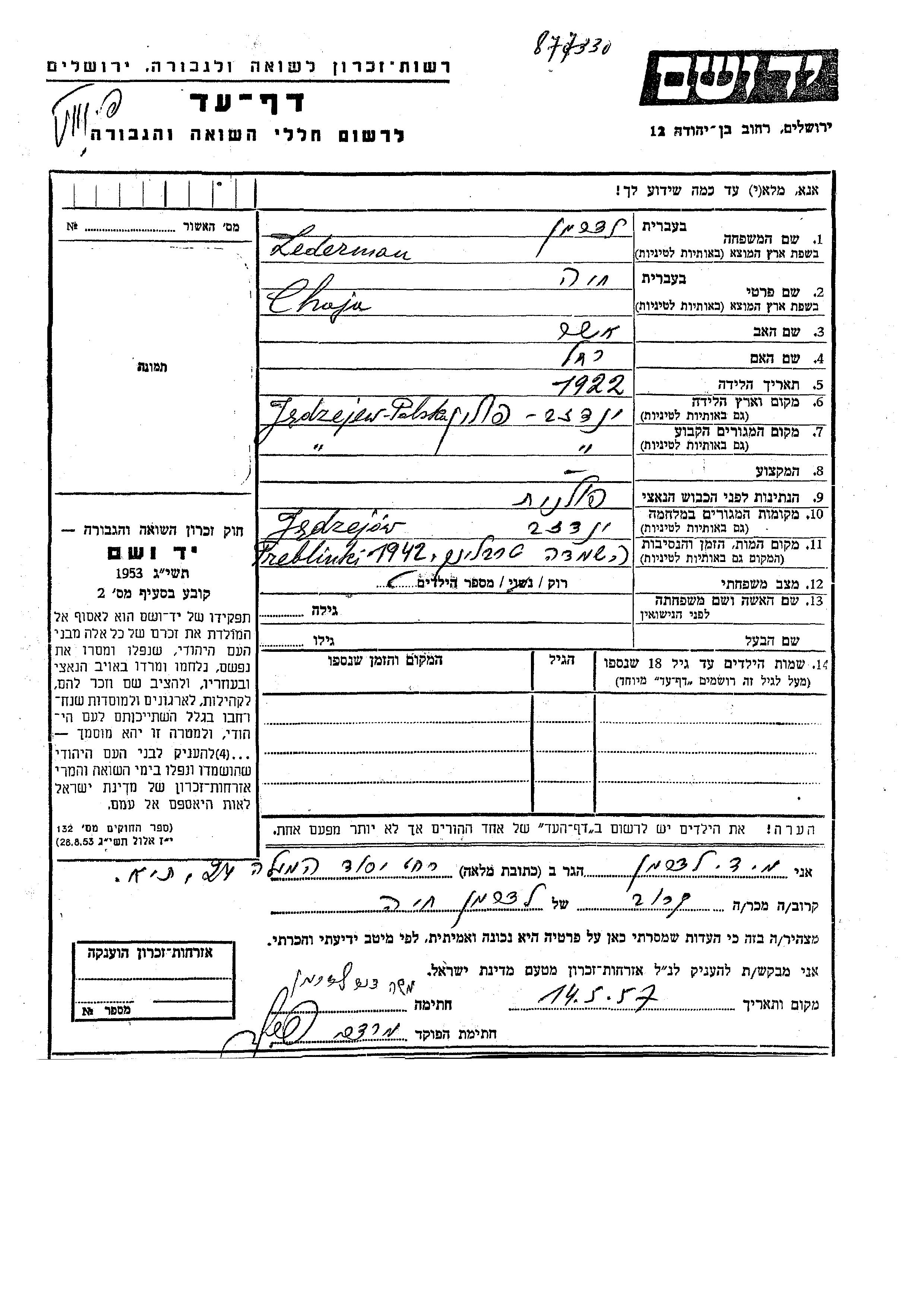 Хая Ледерман, место рождения: Енджеюв, Польша. Отец: Ашер, mать:Рахель. Холост / не замужем. Место жительства до войны: Енджеюв, Польша. Место во время войны: Енджеюв, Польша.