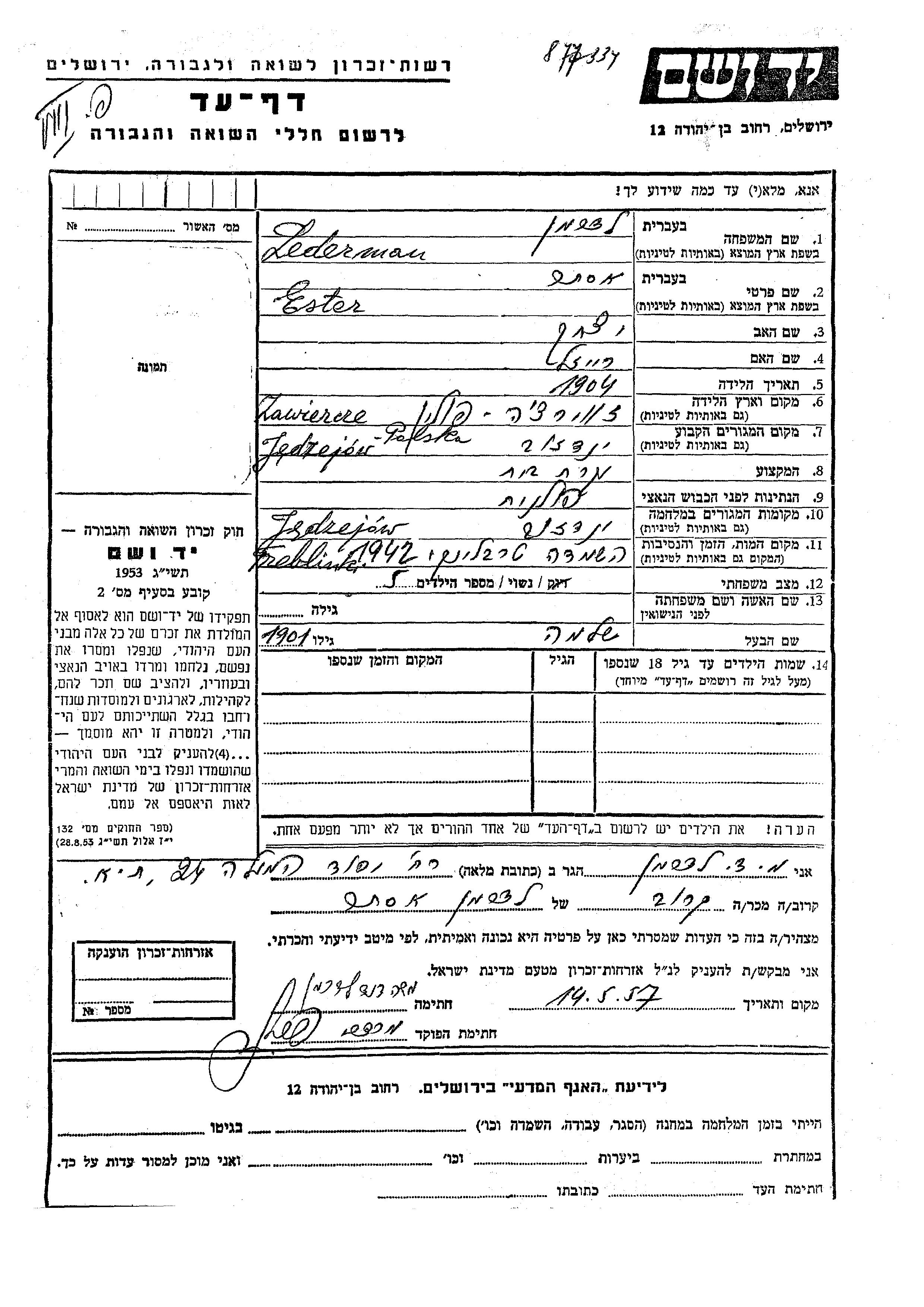 Эстер Ледерман, место рождения: Zawiercze, Польша. Отец: Ицхак, mать:Рейзл. Домохозяйка. Женат / замужем. Место жительства до войны: Енджеюв, Польша. Место во время войны: Енджеюв, Польша.