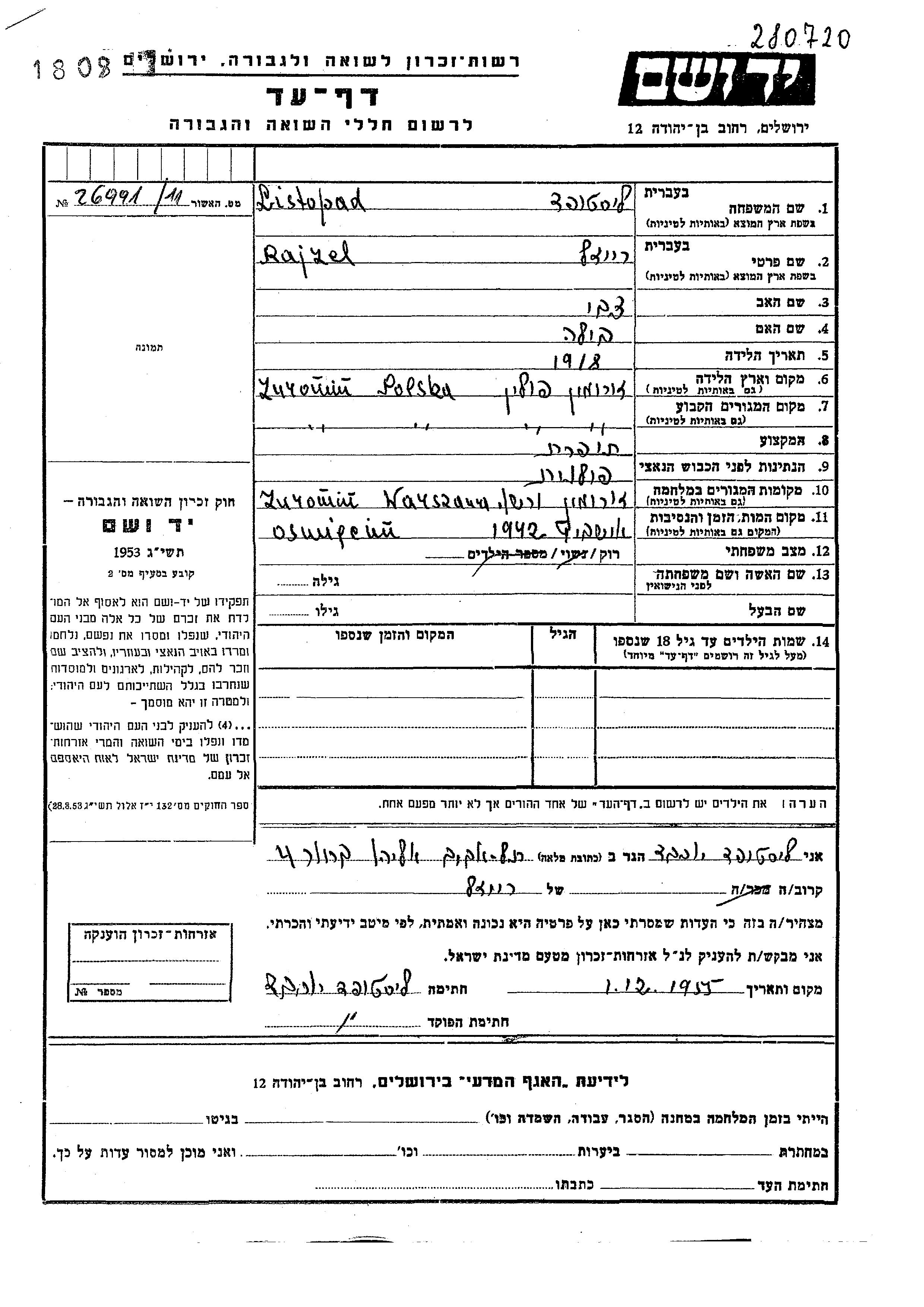 Райзел Листопад, место рождения: Журомин, Польша. Отец: Цви, mать:Била. Швея. Холост / не замужем. Место жительства до войны: Журомин, Польша. Место во время войны: Варшава, Польша.