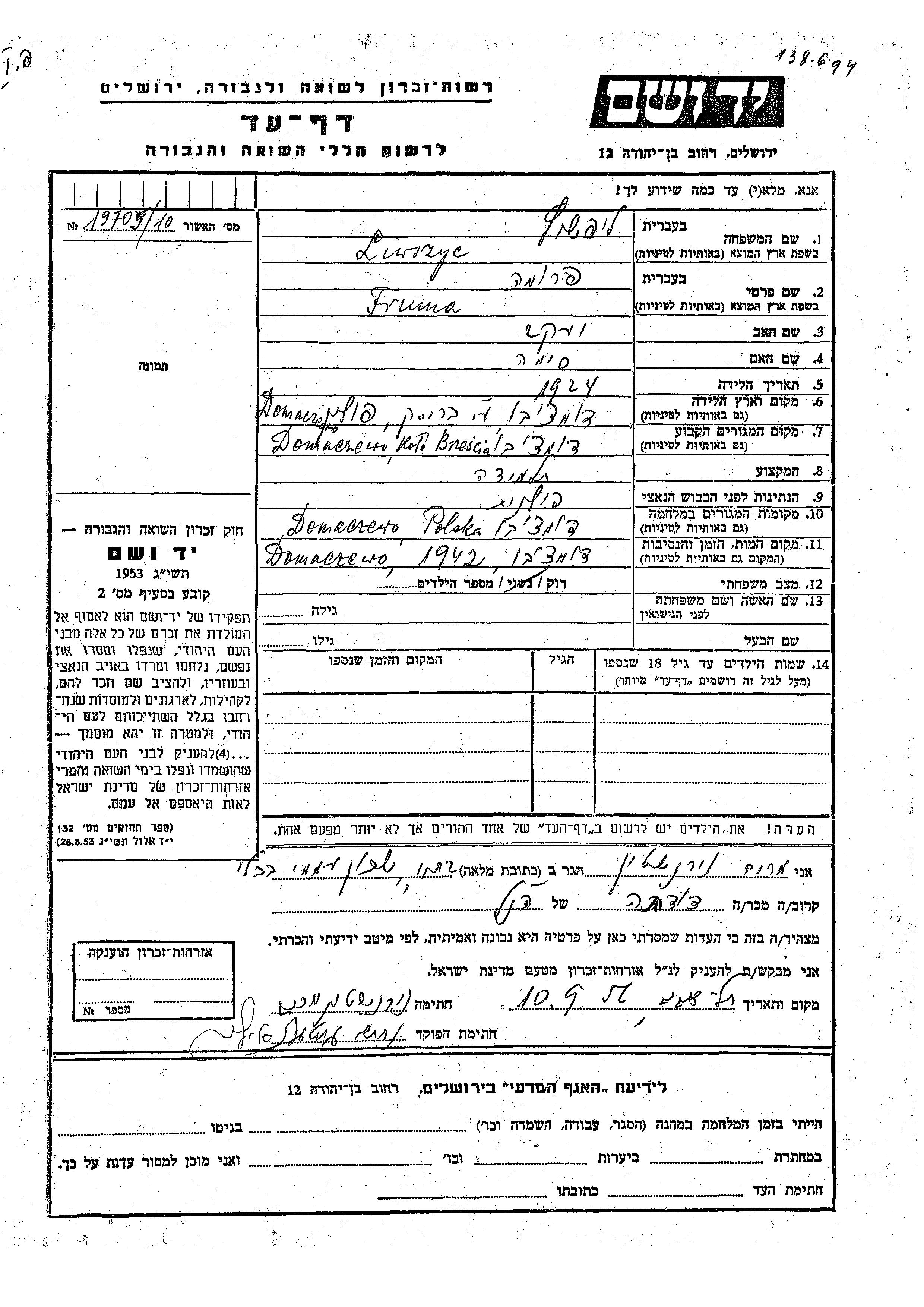 Яд Вашем - Листы свидетельских показаний Мемориального фонда