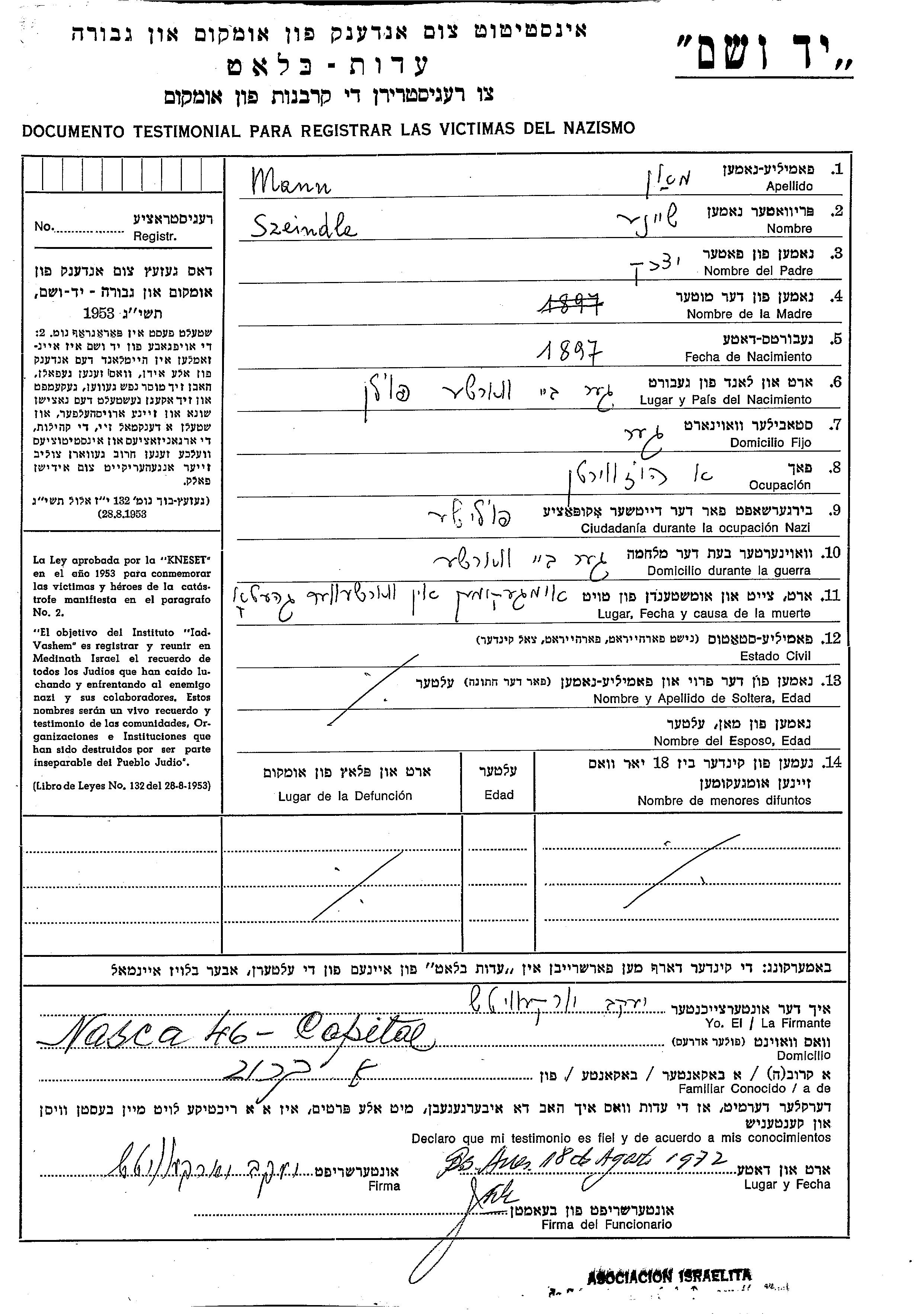 Манн Шейндле 1897 Гора-Кальвария, Польша Лист свидетельских показаний