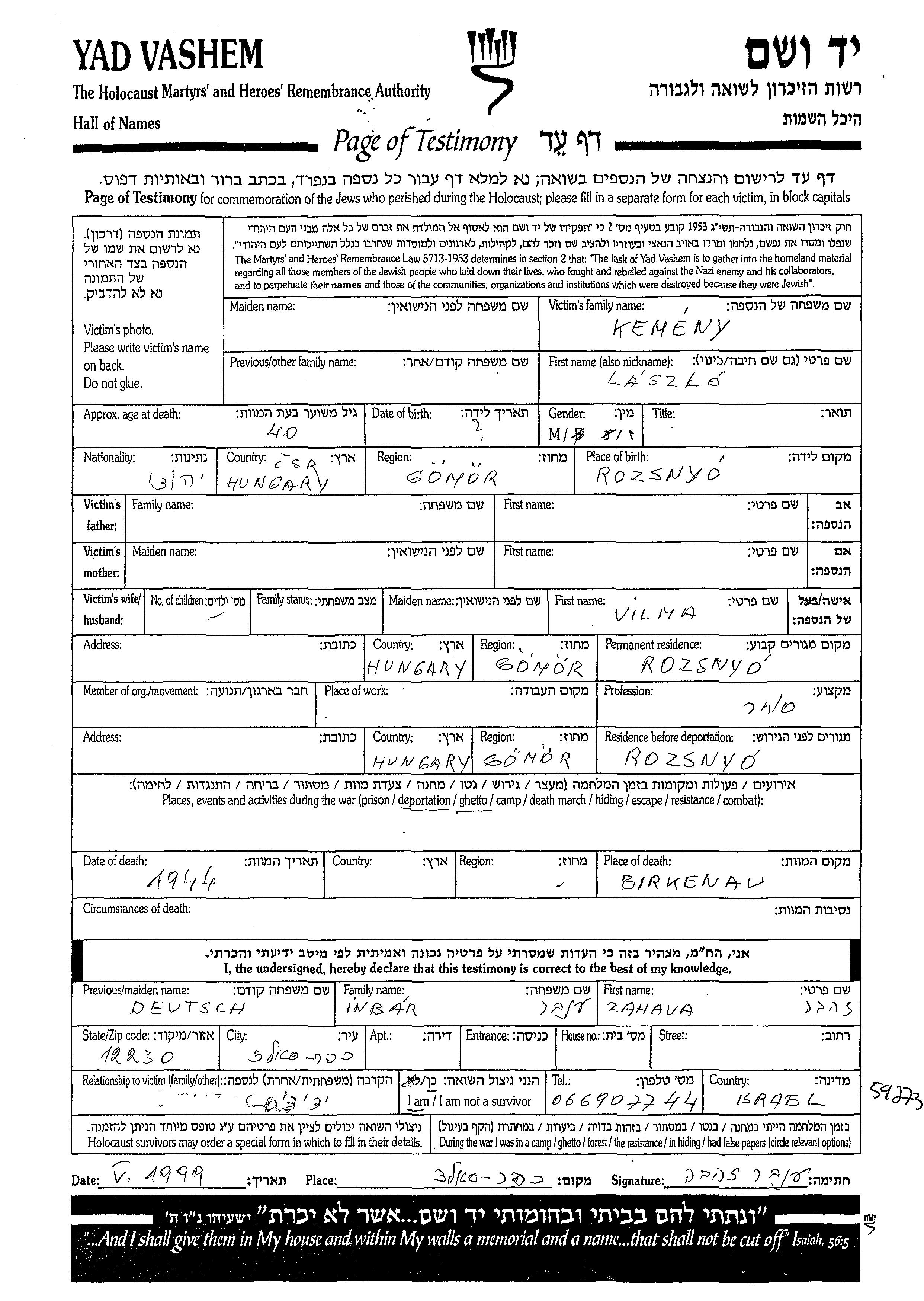 Ласло Кемени, место рождения: Рожньо, Чехословакия. Торговец / торговка. Женат / замужем. Место жительства до войны: Рожньо, Чехословакия. Место во время войны: Рожньо, Чехословакия.