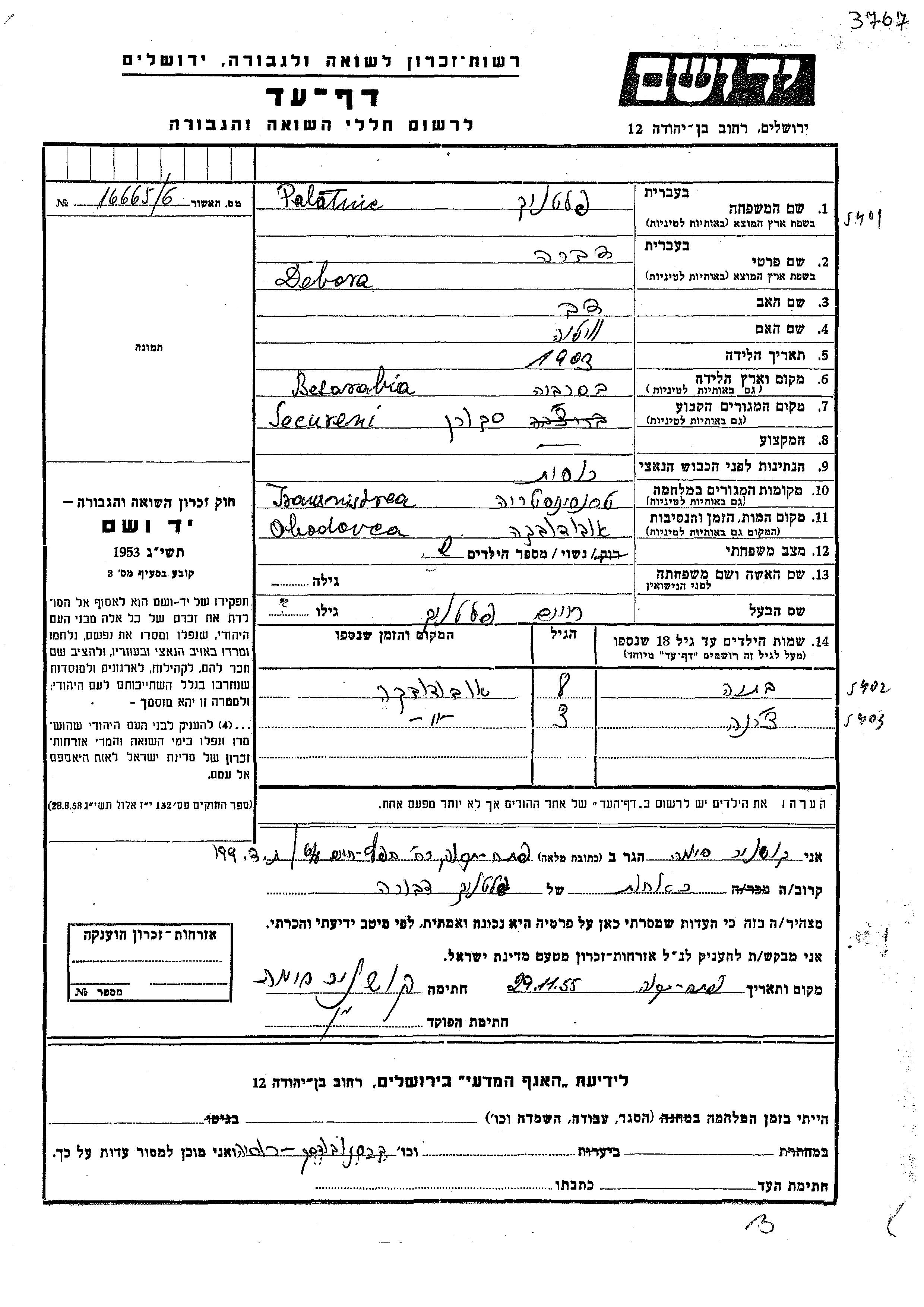 Палатник Плетник Девора 1903 Секуряны, Румыния Лист свидетельских показаний
