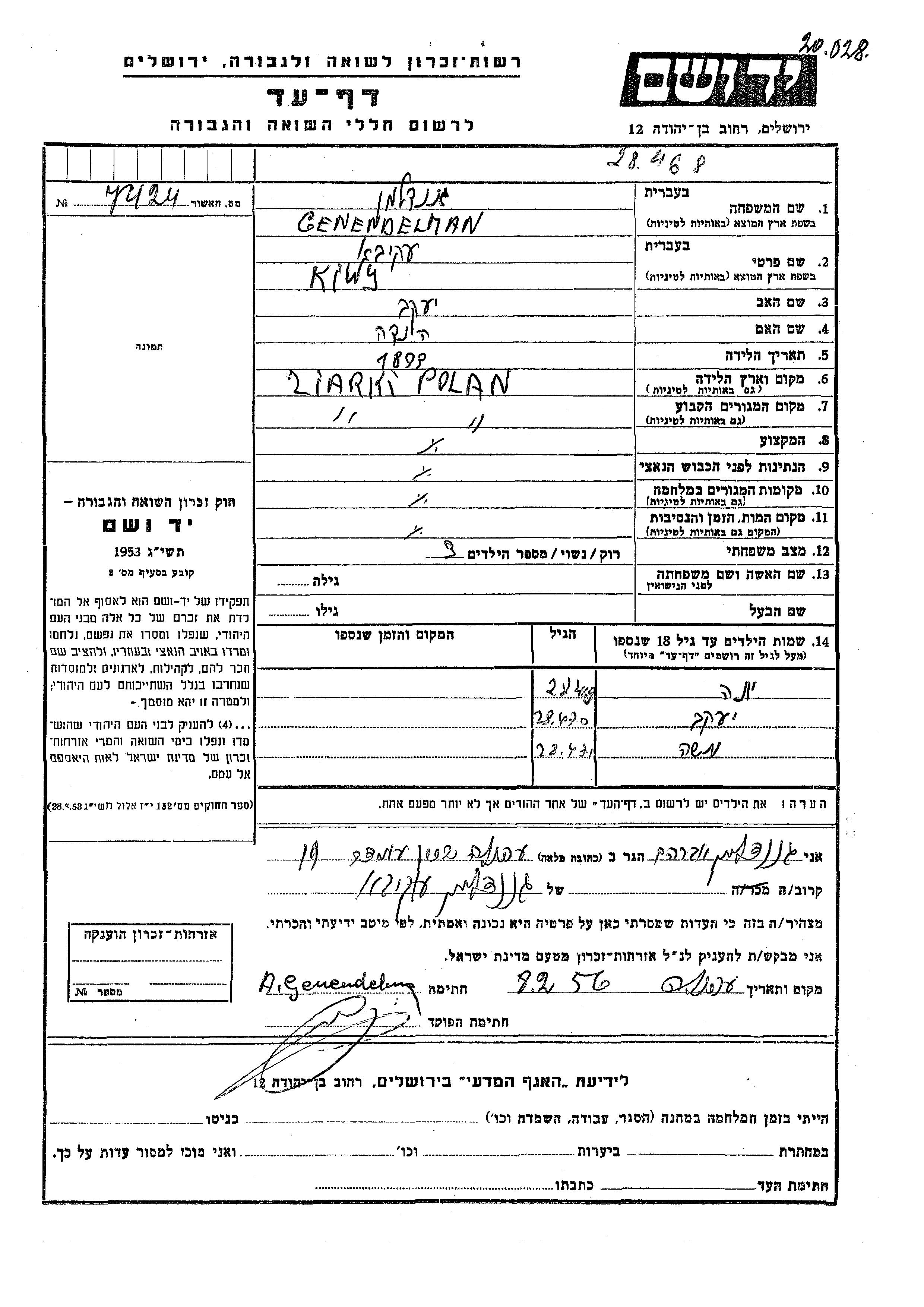 Генендельман Моше Жарки, Польша Лист свидетельских показаний