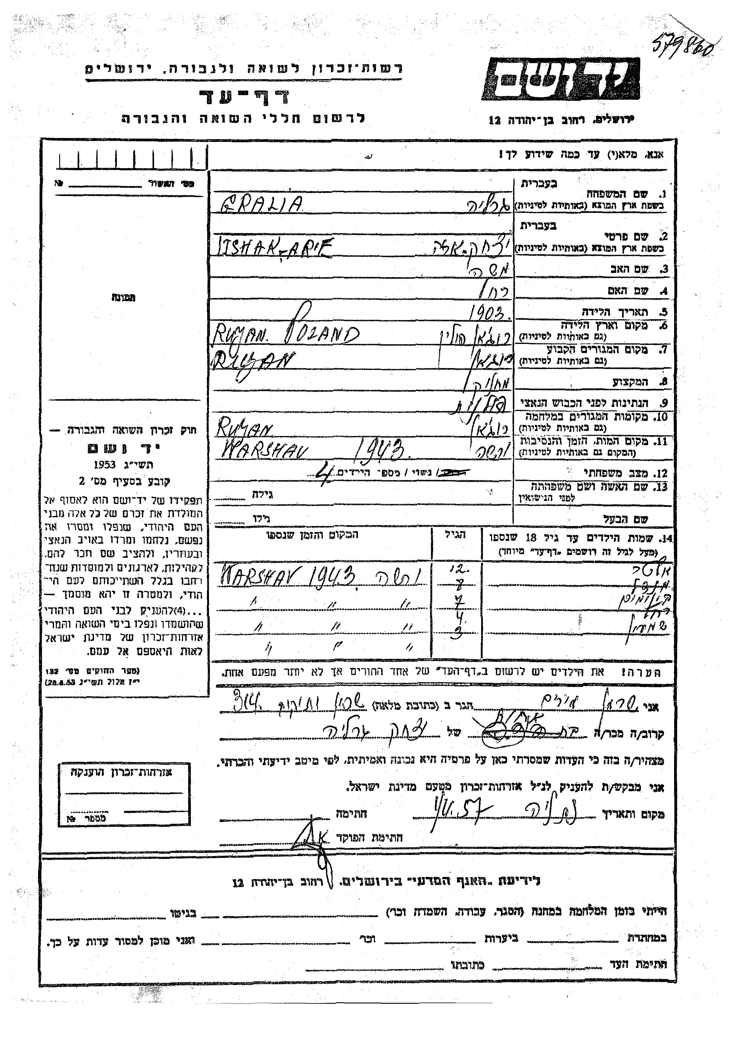 Мендель Граля Ицхак Арье. Ребенок. Место жительства до войны: Рожан, Польша. Место во время войны: Рожан, Польша.