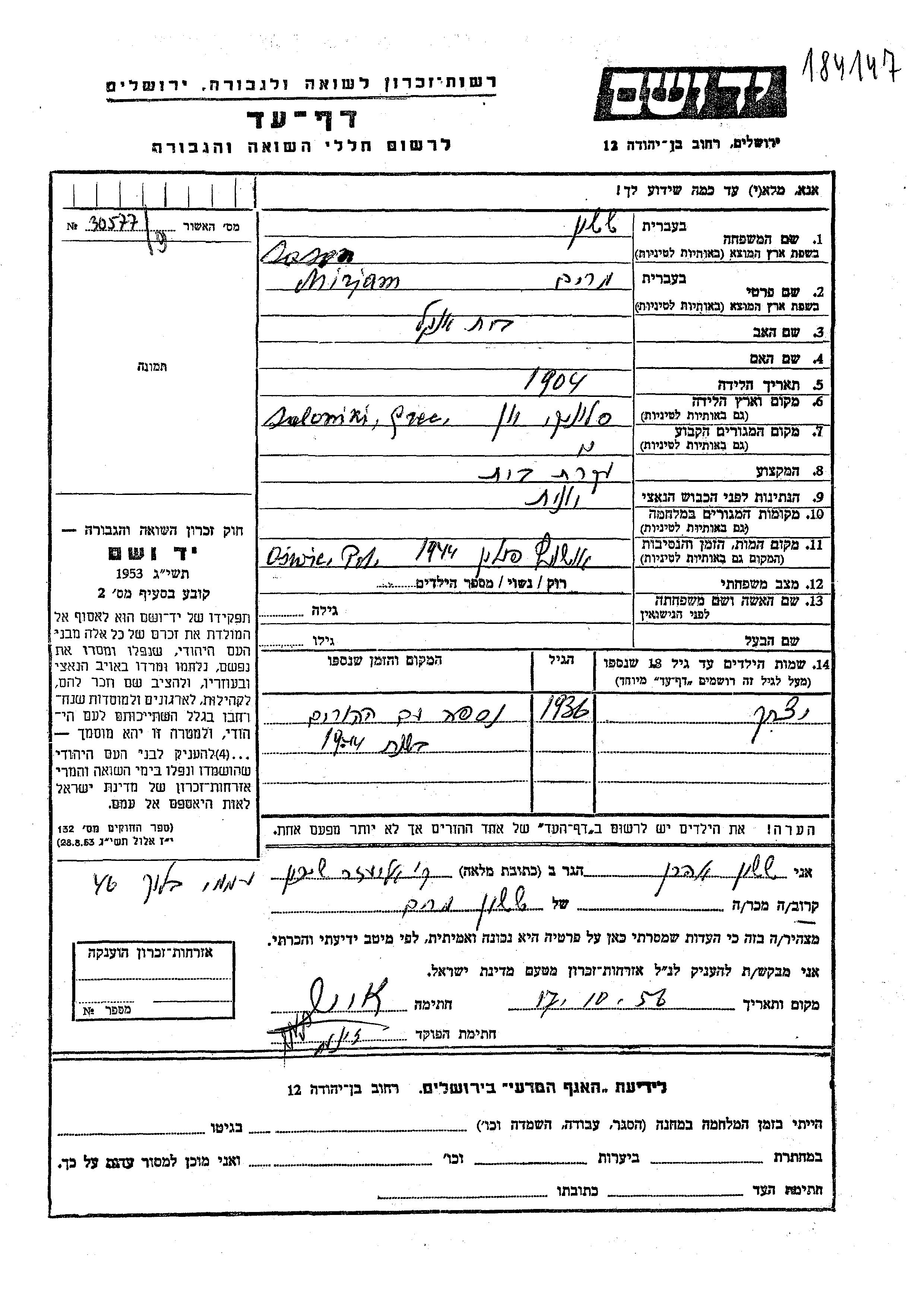 Сасон Ицхак Салоники, Греция Лист свидетельских показаний