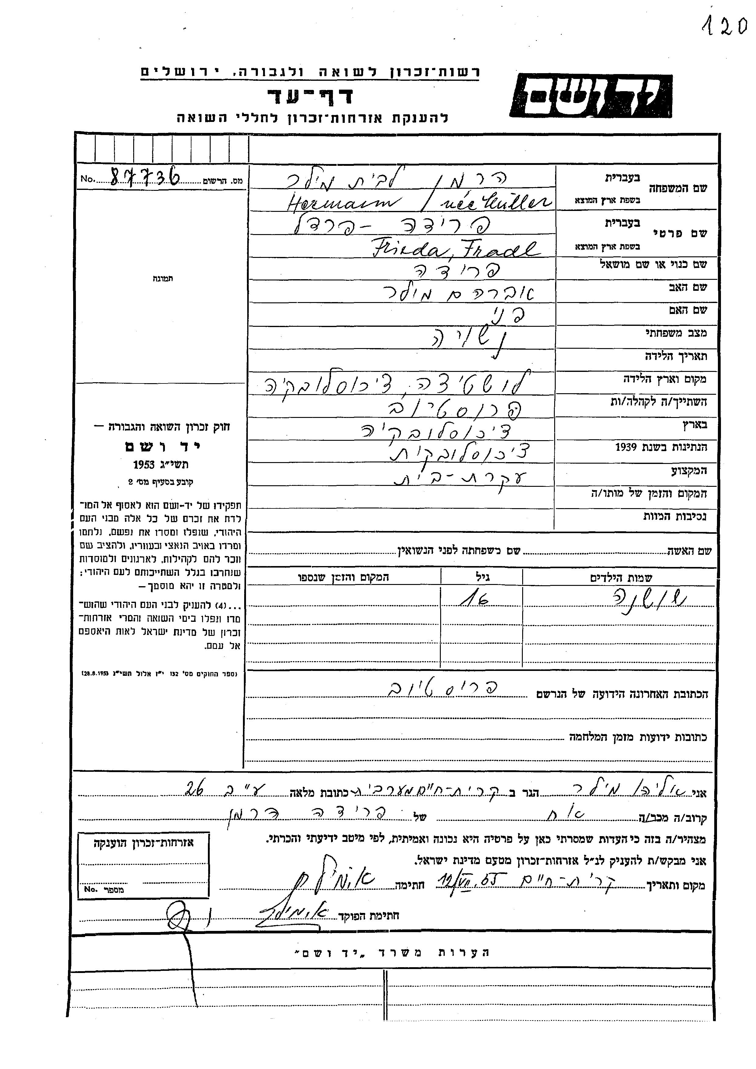 Шошана Херманн Фрадл девичья фамилия Миллер. Ребенок. Место жительства до войны: Простеёв, Чехословакия. Место во время войны: Простеёв, Чехословакия.