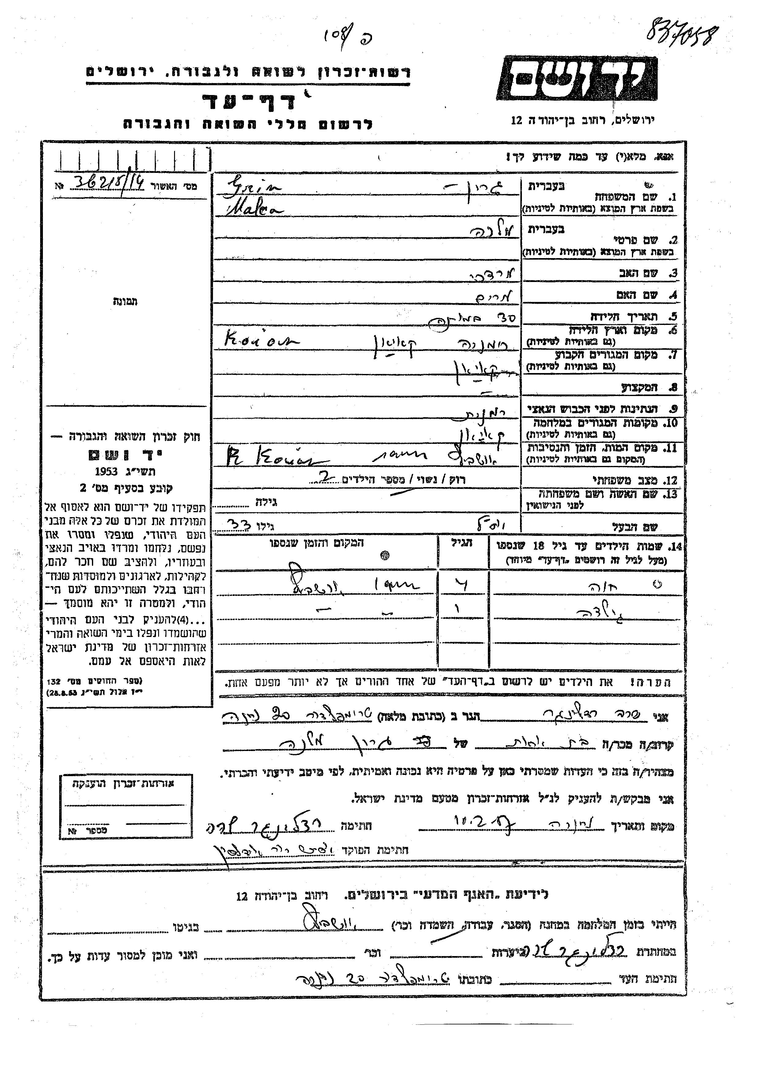 Яд Вашем - Листы свидетельских показаний Мемориального фонда