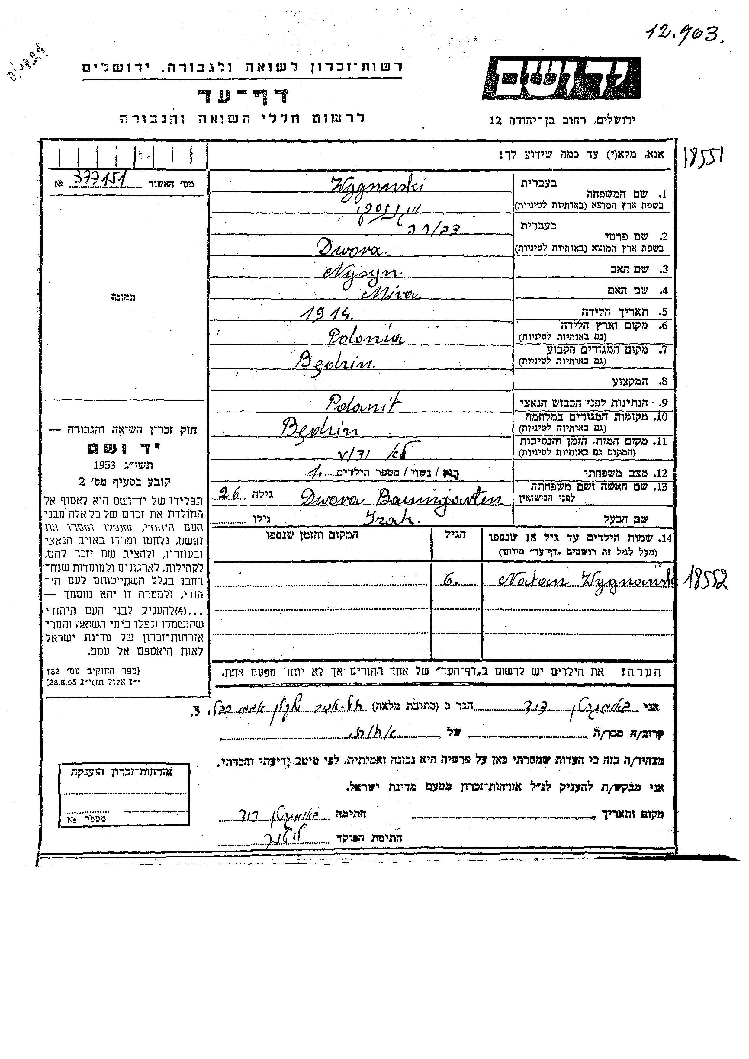 Натан Выгнански Изак Двора девичья фамилия Баумгартен. Ребенок. Место жительства до войны: Бендзин, Польша. Место во время войны: Бендзин, Польша.