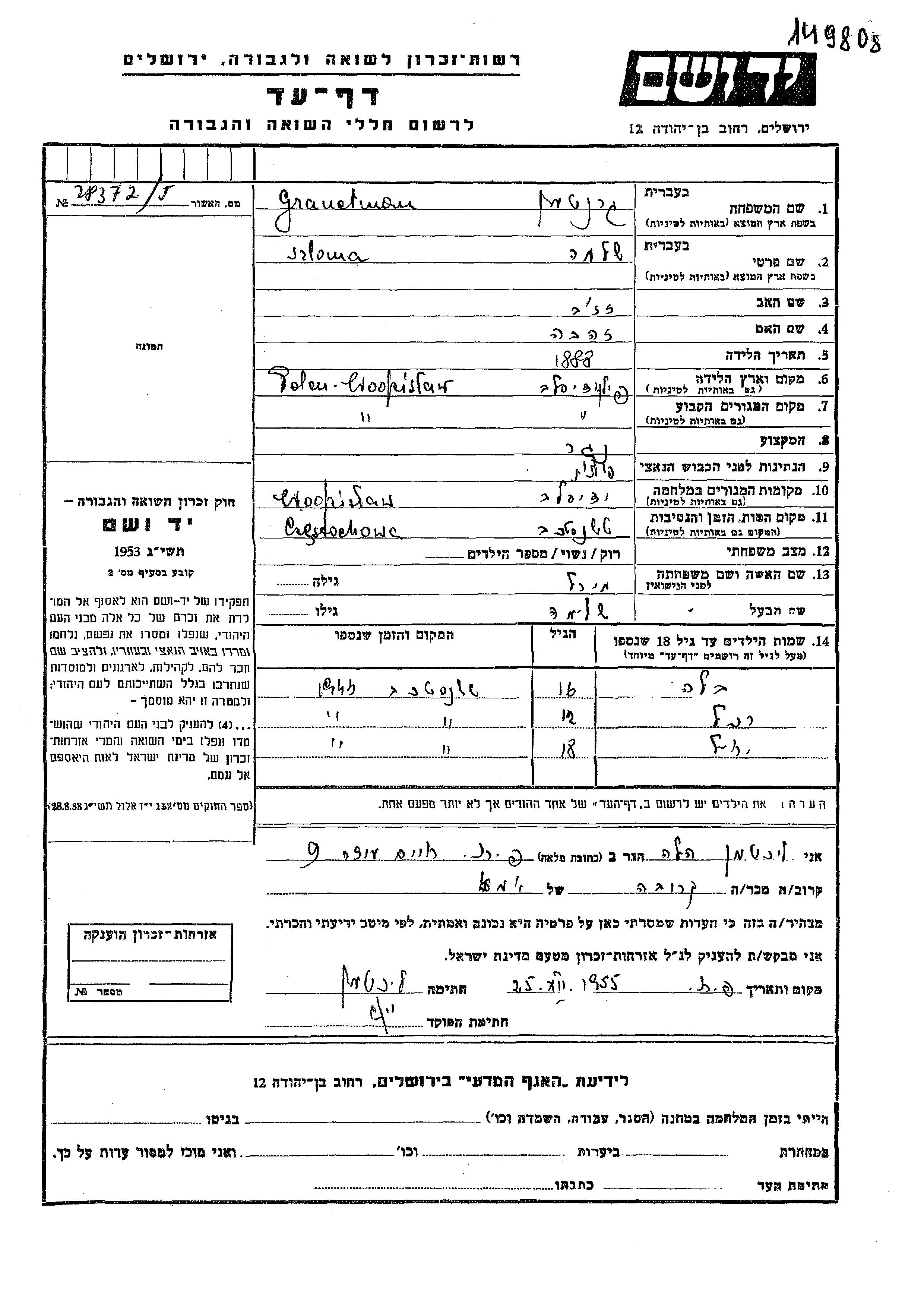 Иехиль Гранетман. Отец: Шломо, mать:Михаль. Ребенок. Место во время войны: Водзислав, Польша.