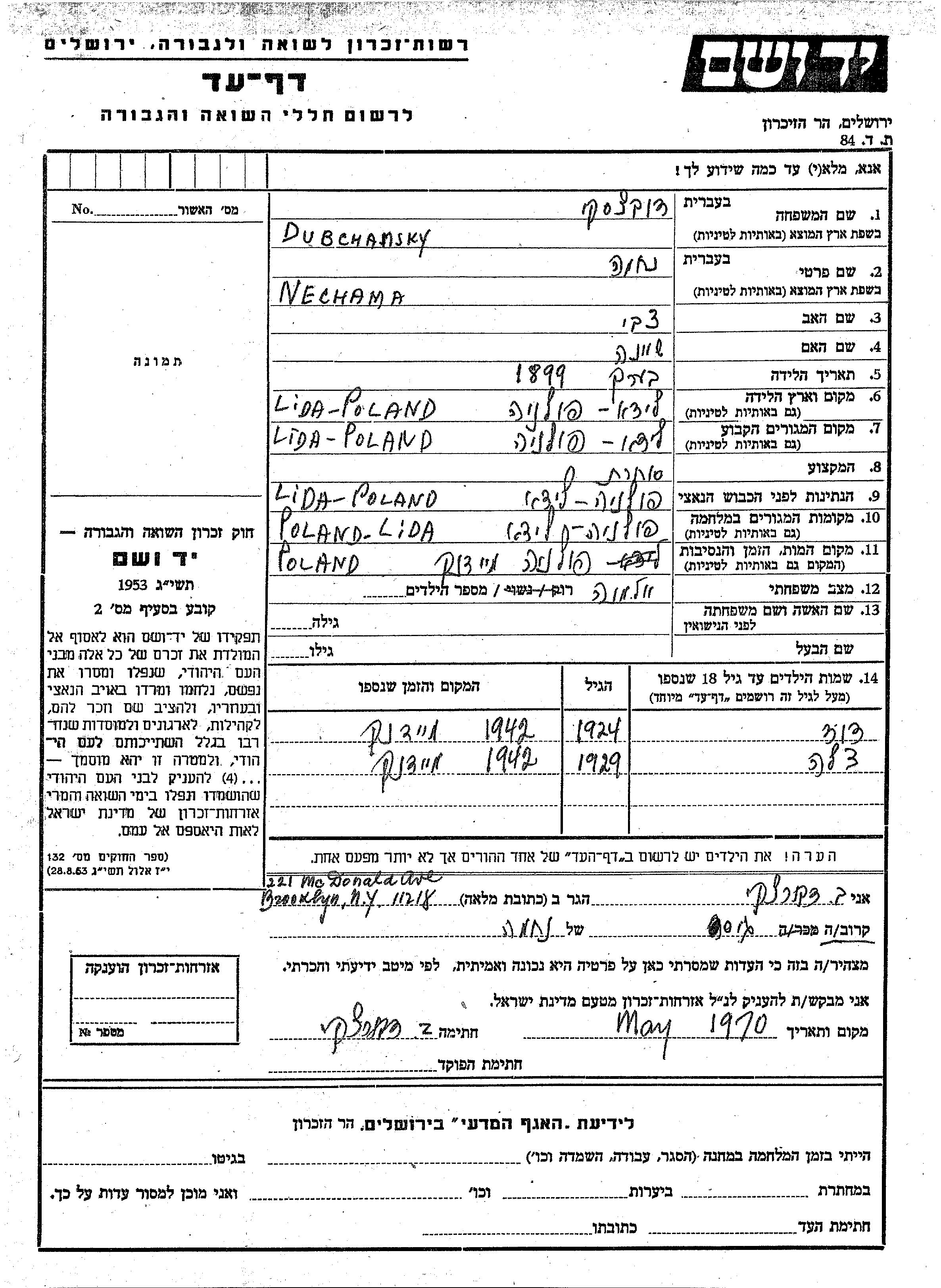Дела Дубчански Нехама. Ребенок. Место жительства до войны: Лида, Польша. Место во время войны: Лида, Польша.