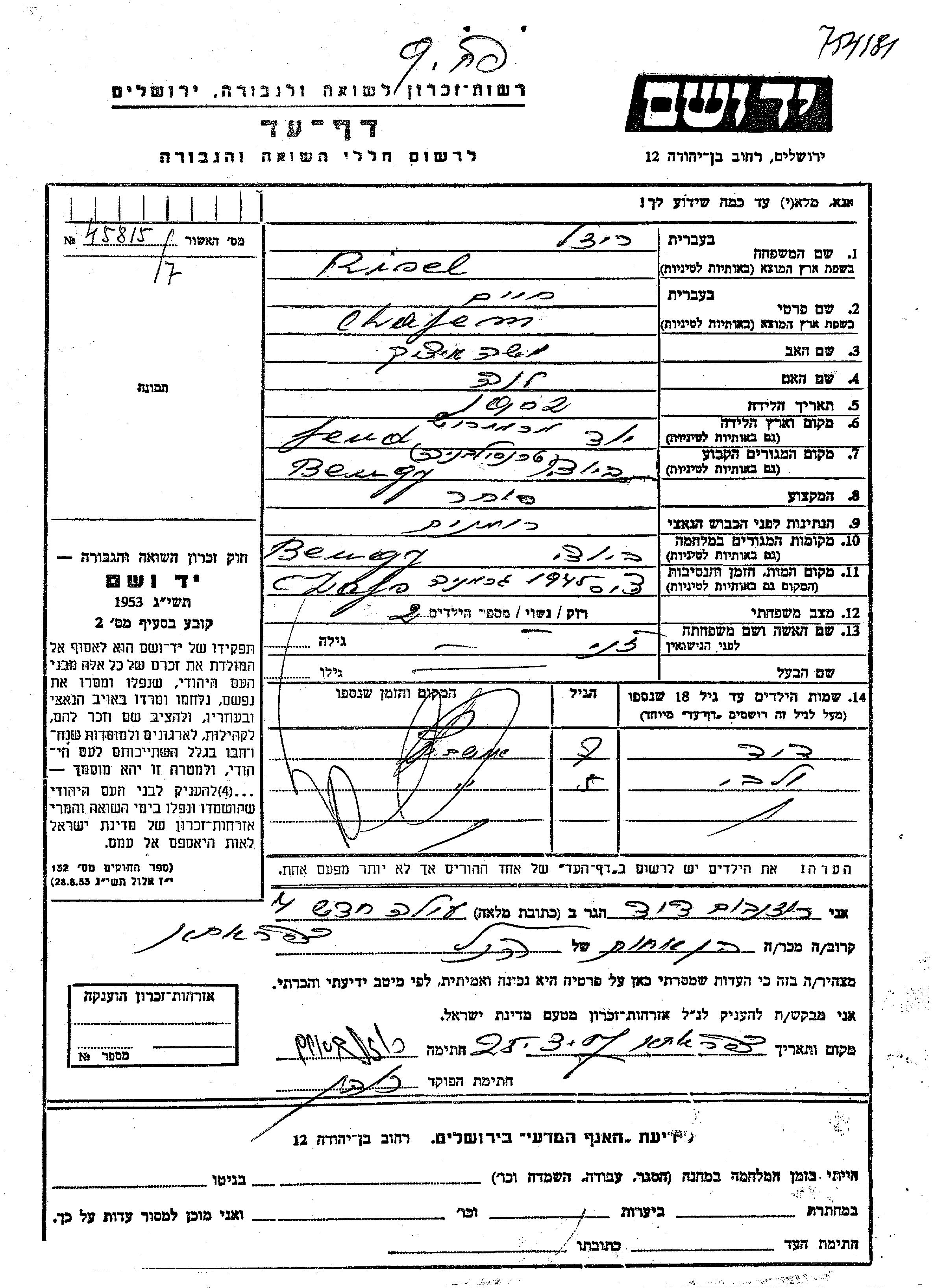 Яд Вашем - Листы свидетельских показаний Мемориального фонда