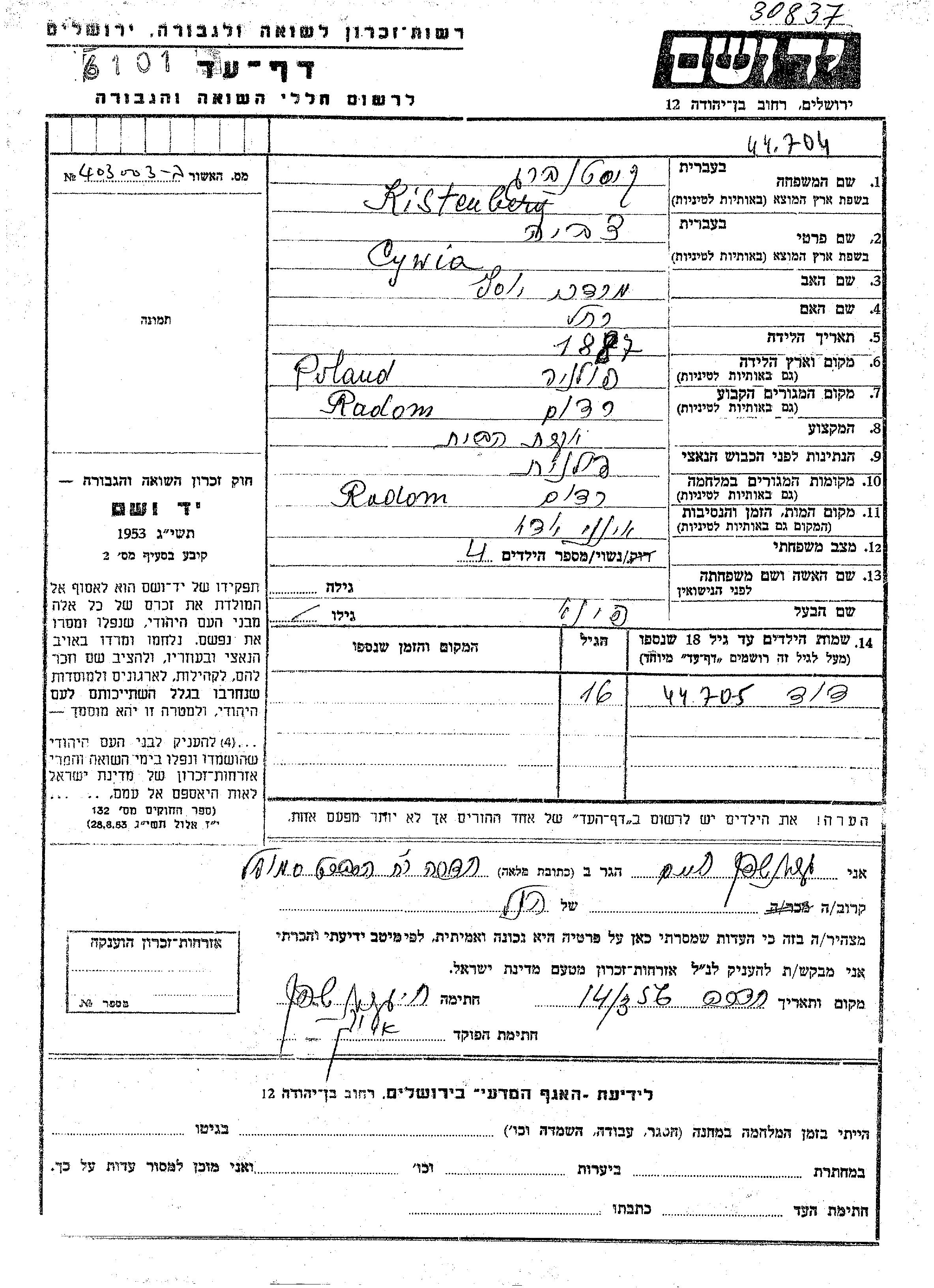 Кистенберг Давид Радом, Польша Лист свидетельских показаний