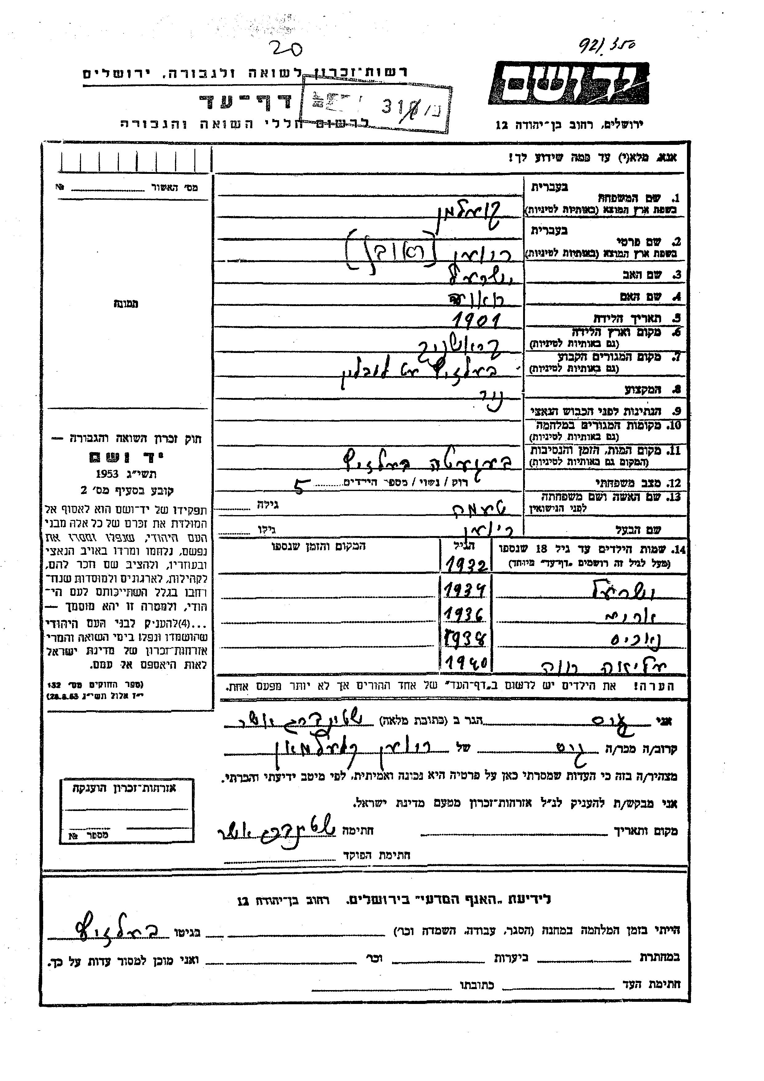 Яд Вашем - Листы свидетельских показаний Мемориального фонда