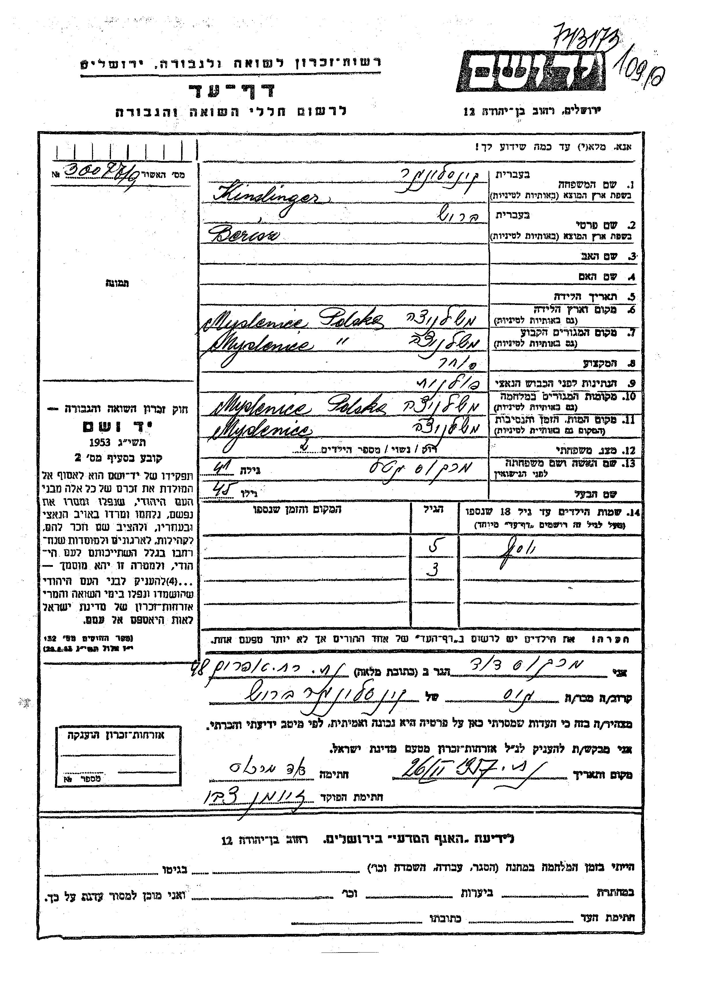 Кинслингер Иосеф Мысленице, Польша Лист свидетельских показаний