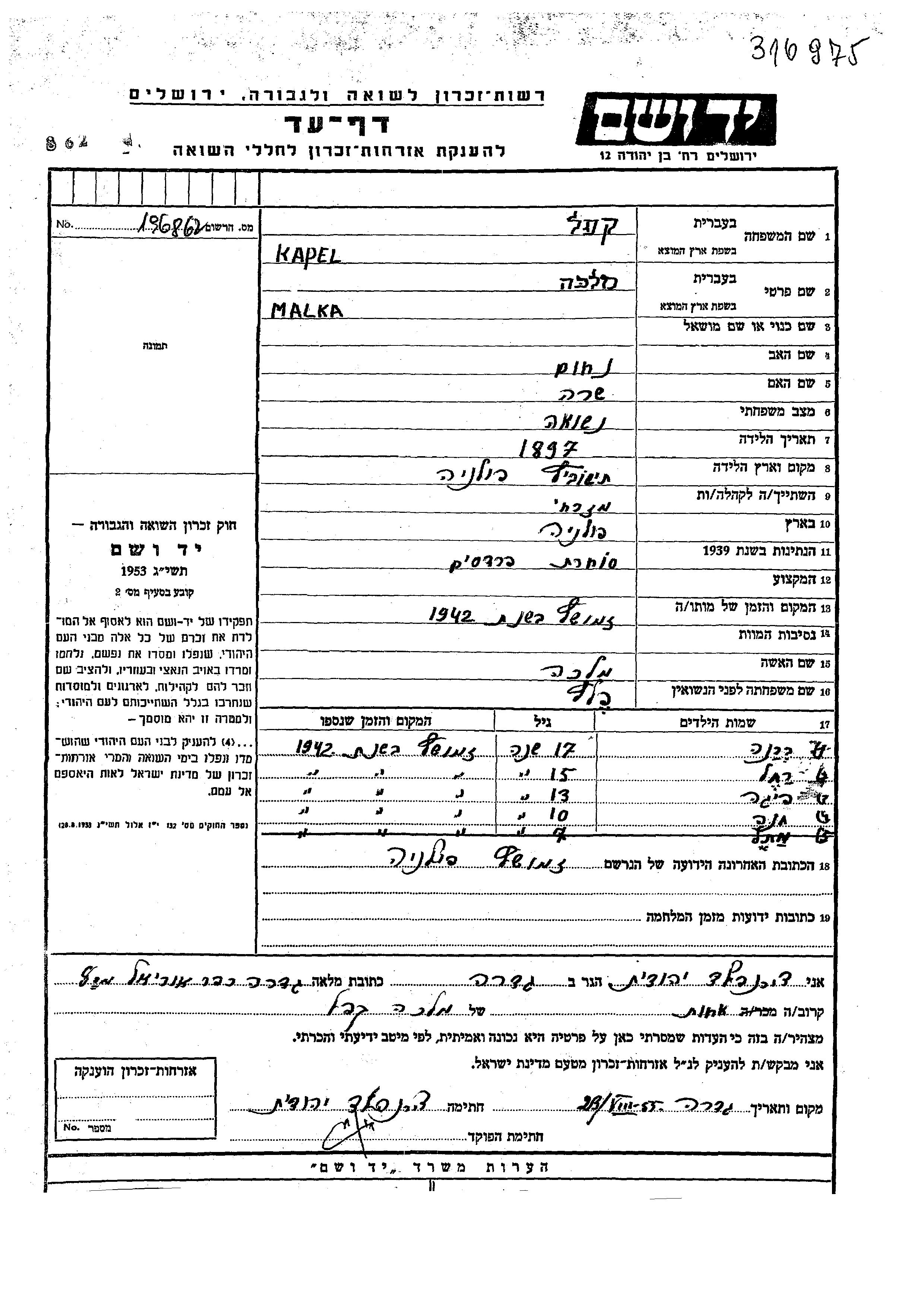 Яд Вашем - Листы свидетельских показаний Мемориального фонда