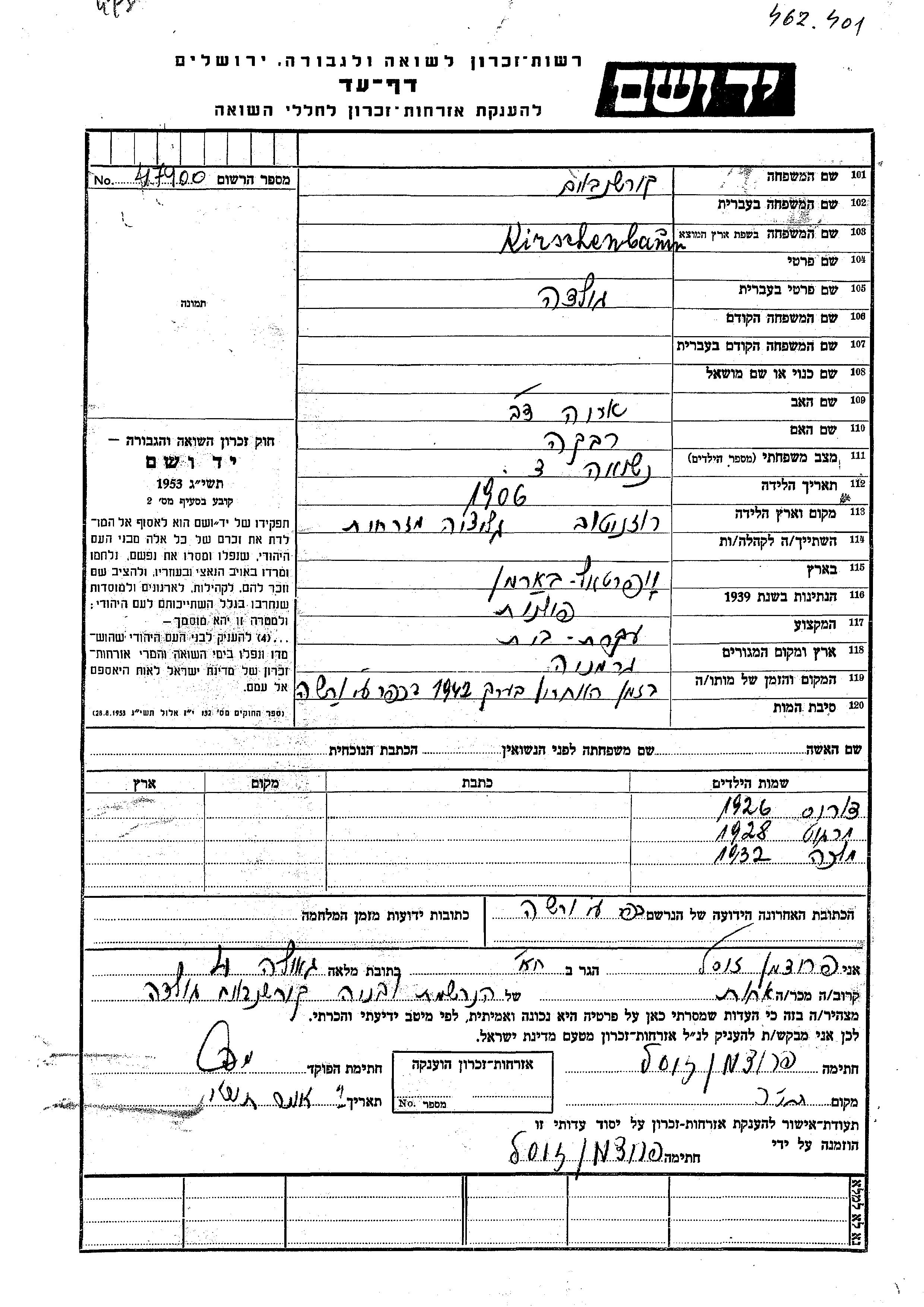 Киршенбаум Маргот 1928 место не указано, Лист свидетельских показаний
