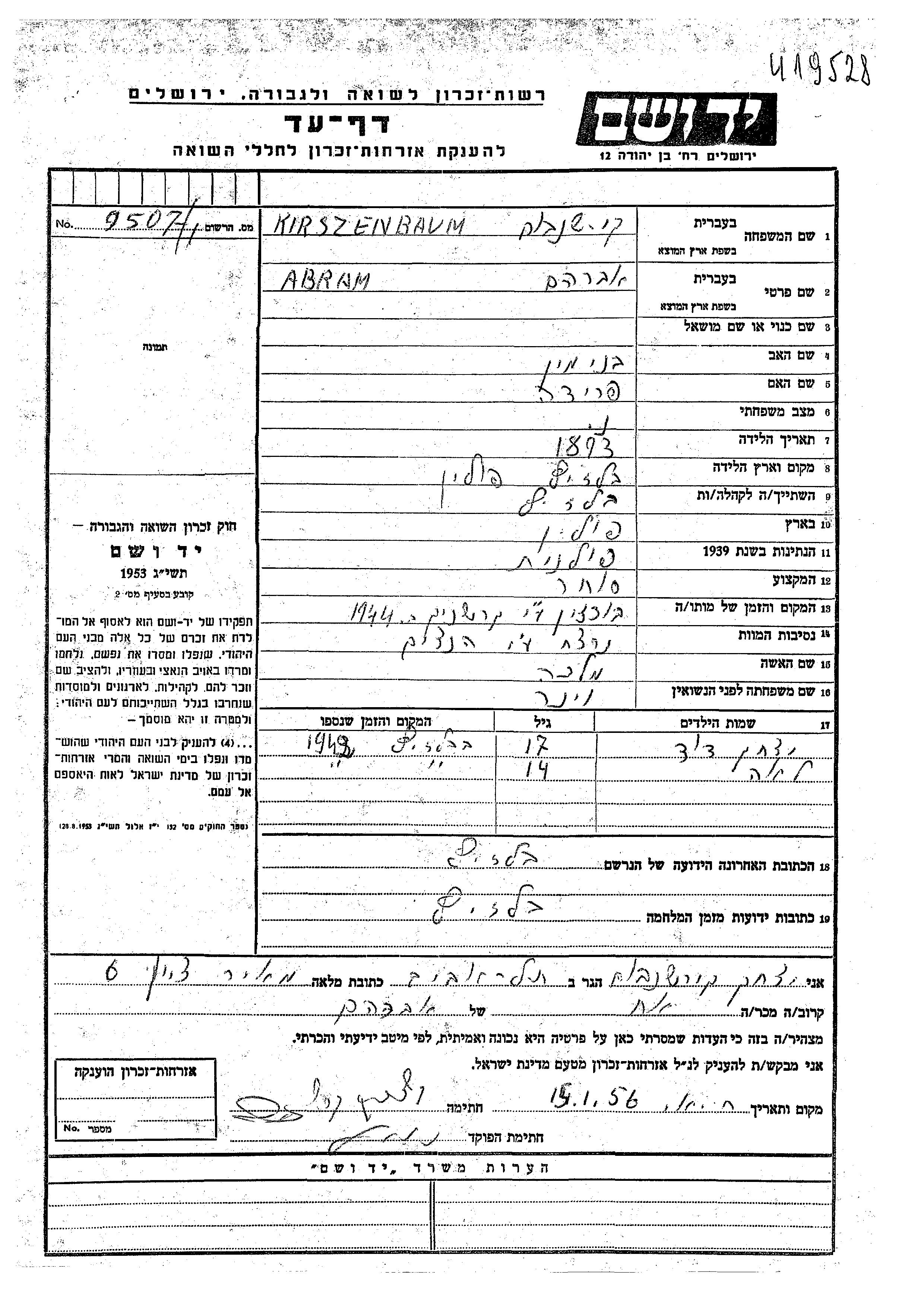 Киршенбаум Лея Белжец, Польша Лист свидетельских показаний