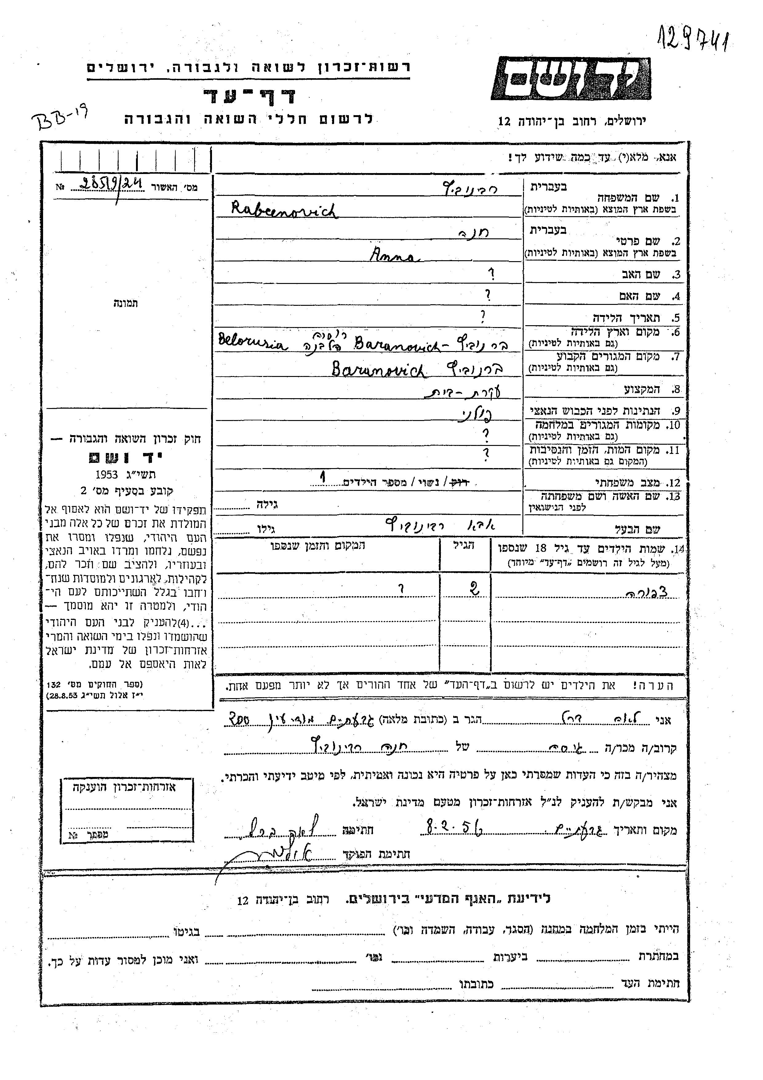 Рабанович Ципора Барановичи, Польша Лист свидетельских показаний