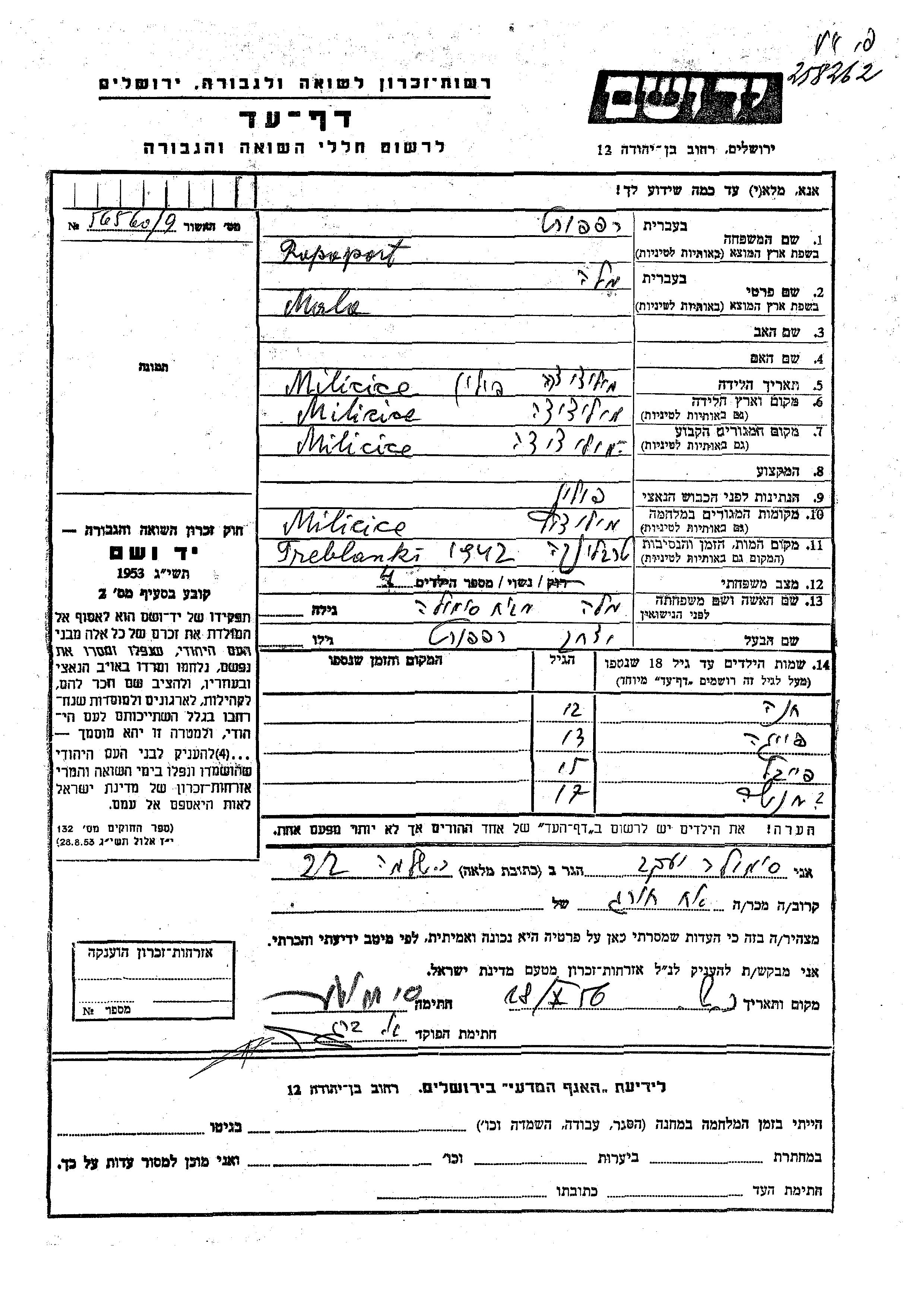Рапапорт Хана Милейчице, Польша Лист свидетельских показаний