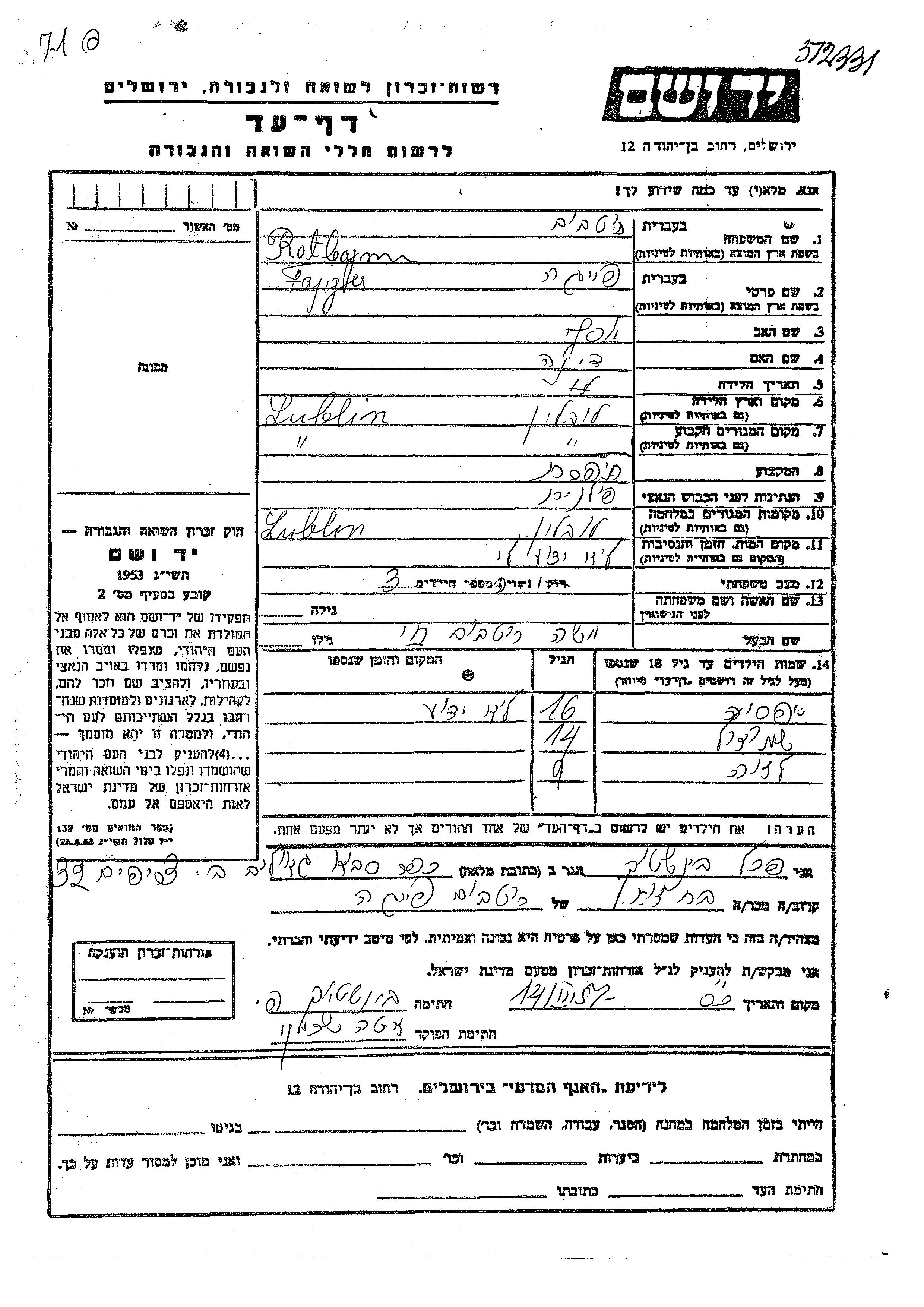 Ротбайн Ротбаум Песя Люблин, Польша Лист свидетельских показаний