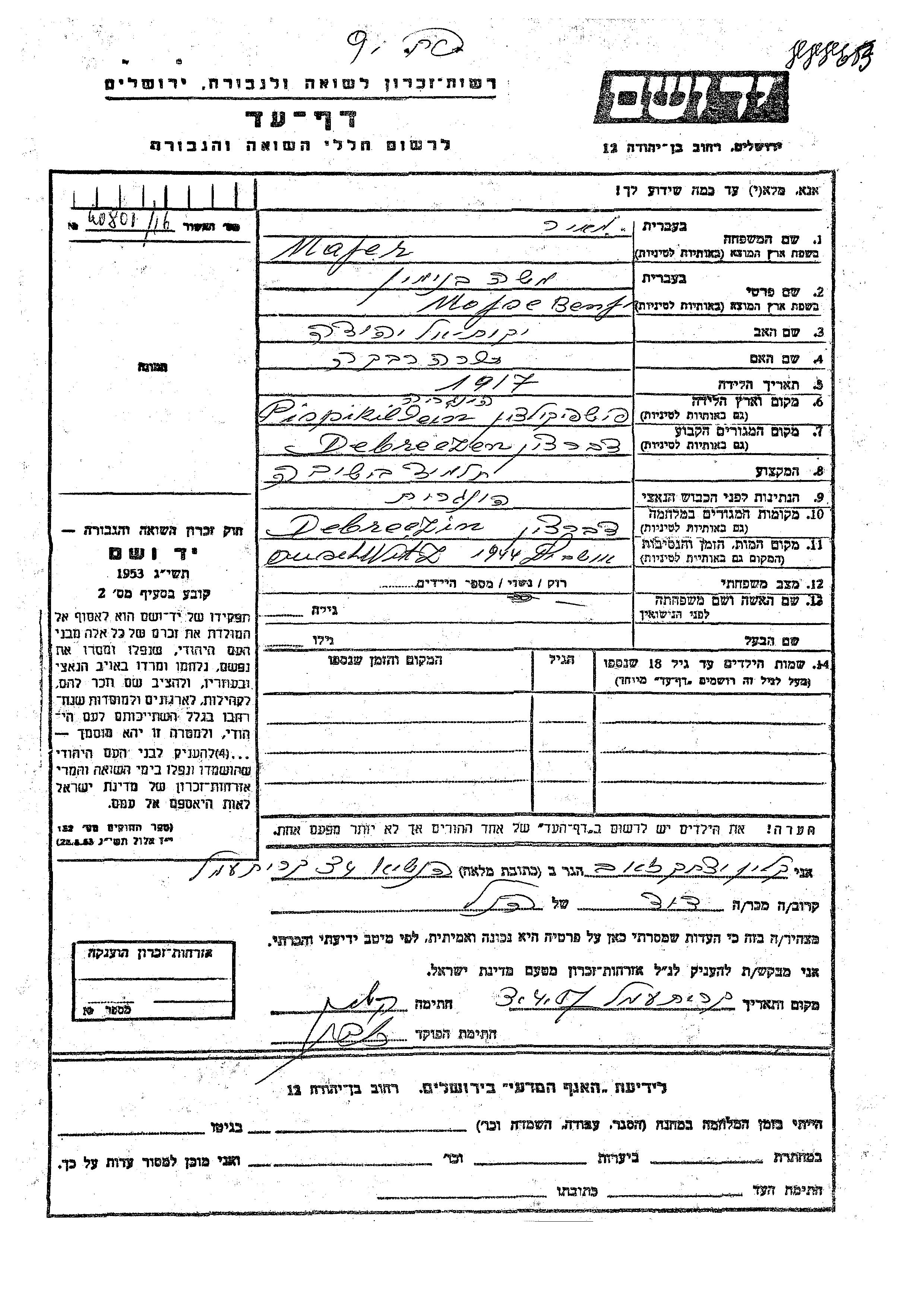 Маер Мойше Бенья 1917 Дебрецен, Венгрия Лист свидетельских показаний