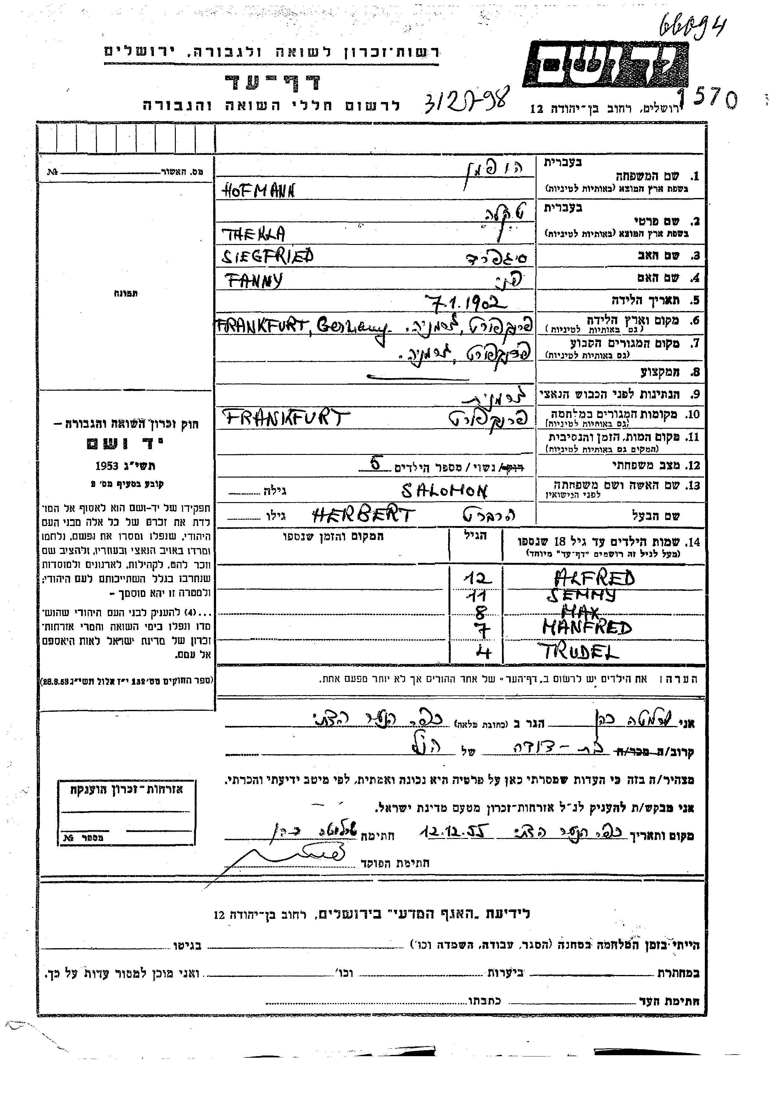 Трудель Хофманн Херберт Текла девичья фамилия Саломон. Ребенок. Место жительства до войны: Франкфурт, Германия. Место во время войны: Франкфурт, Германия.
