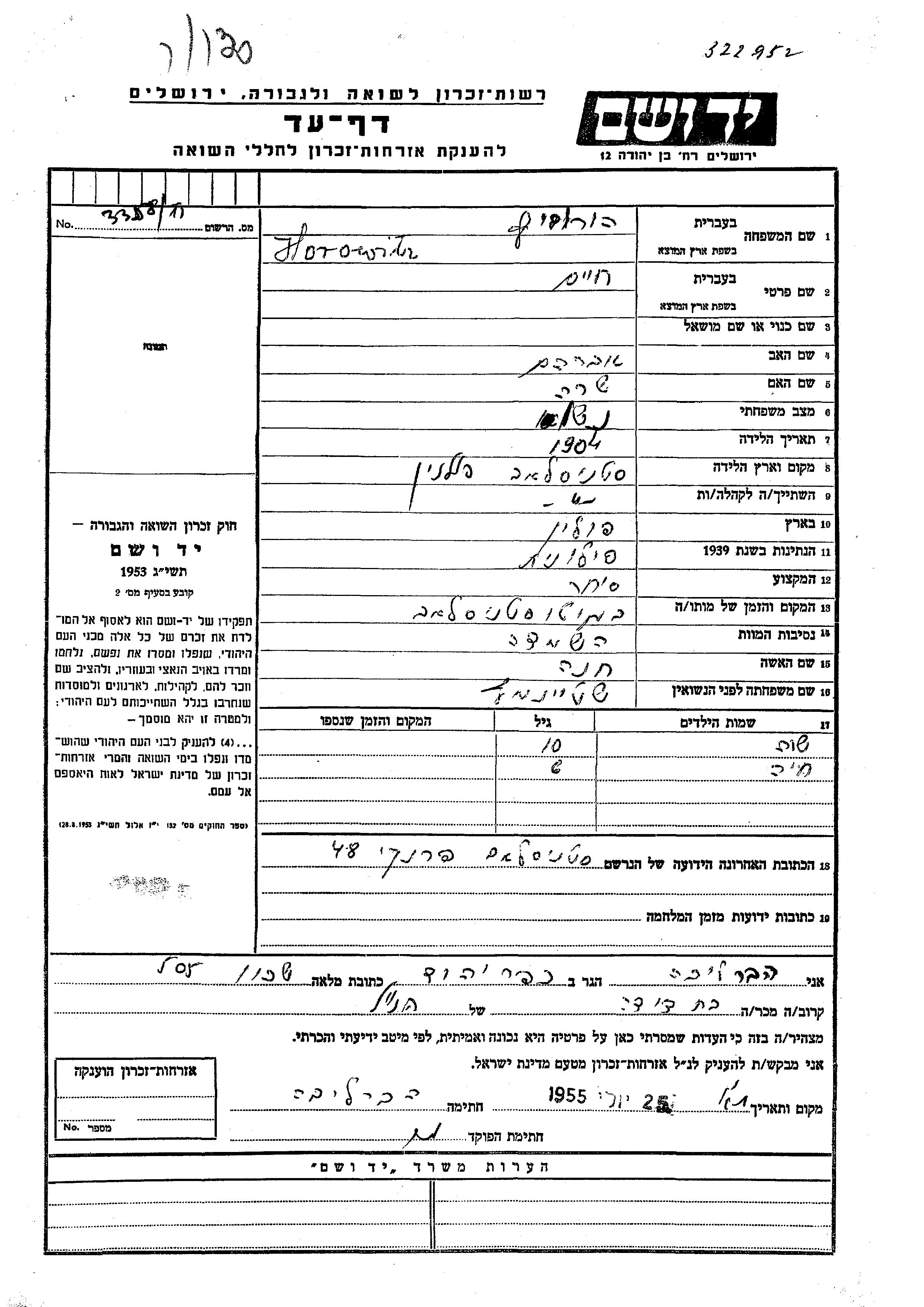 Хоровиц Хая место не указано, Лист свидетельских показаний