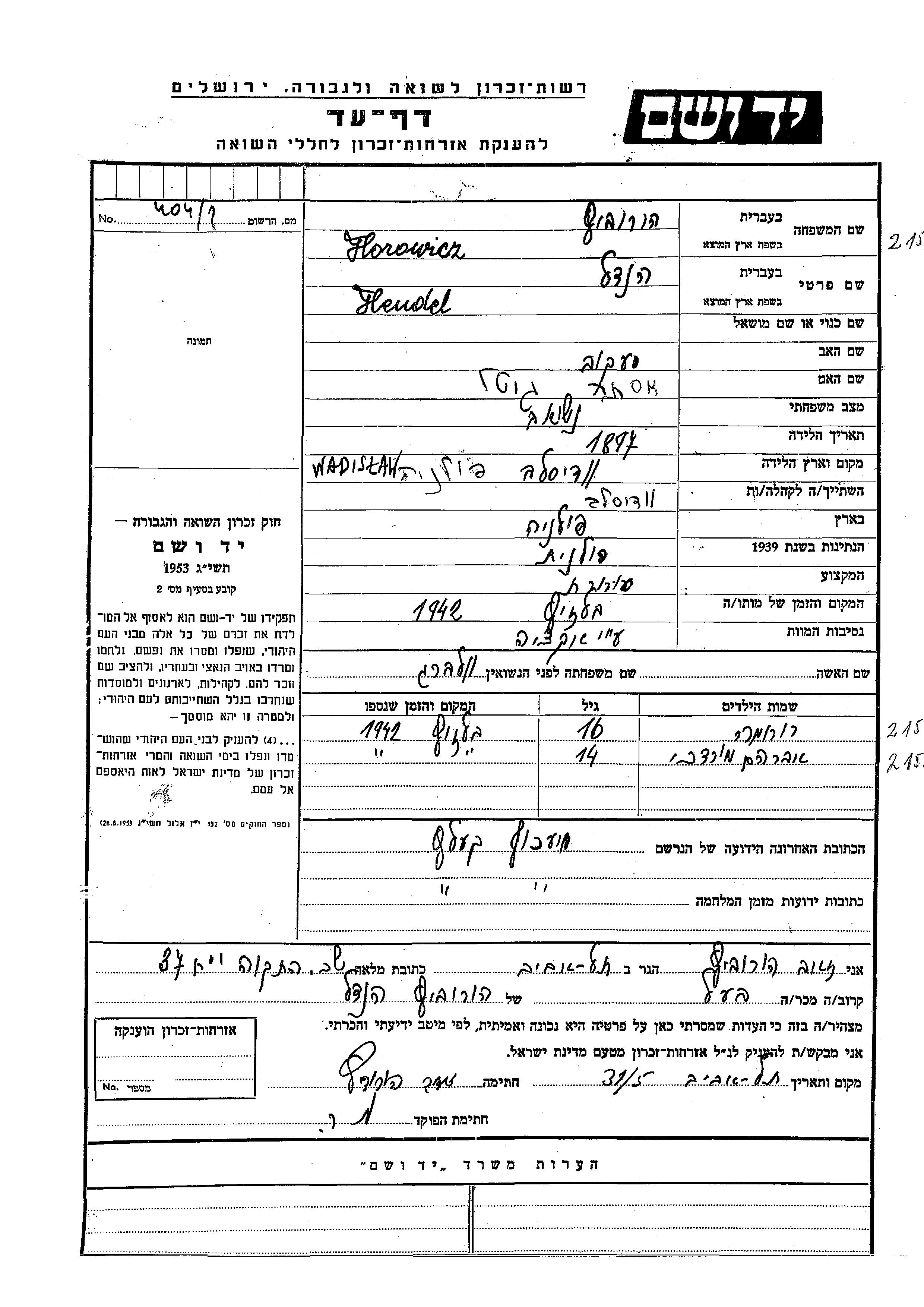 Авраам Мордехай Хорович Хендель девичья фамилия Вольберг. Ребенок. Место жительства до войны: Водзислав, Польша. Место во время войны: Мехув, Польша.