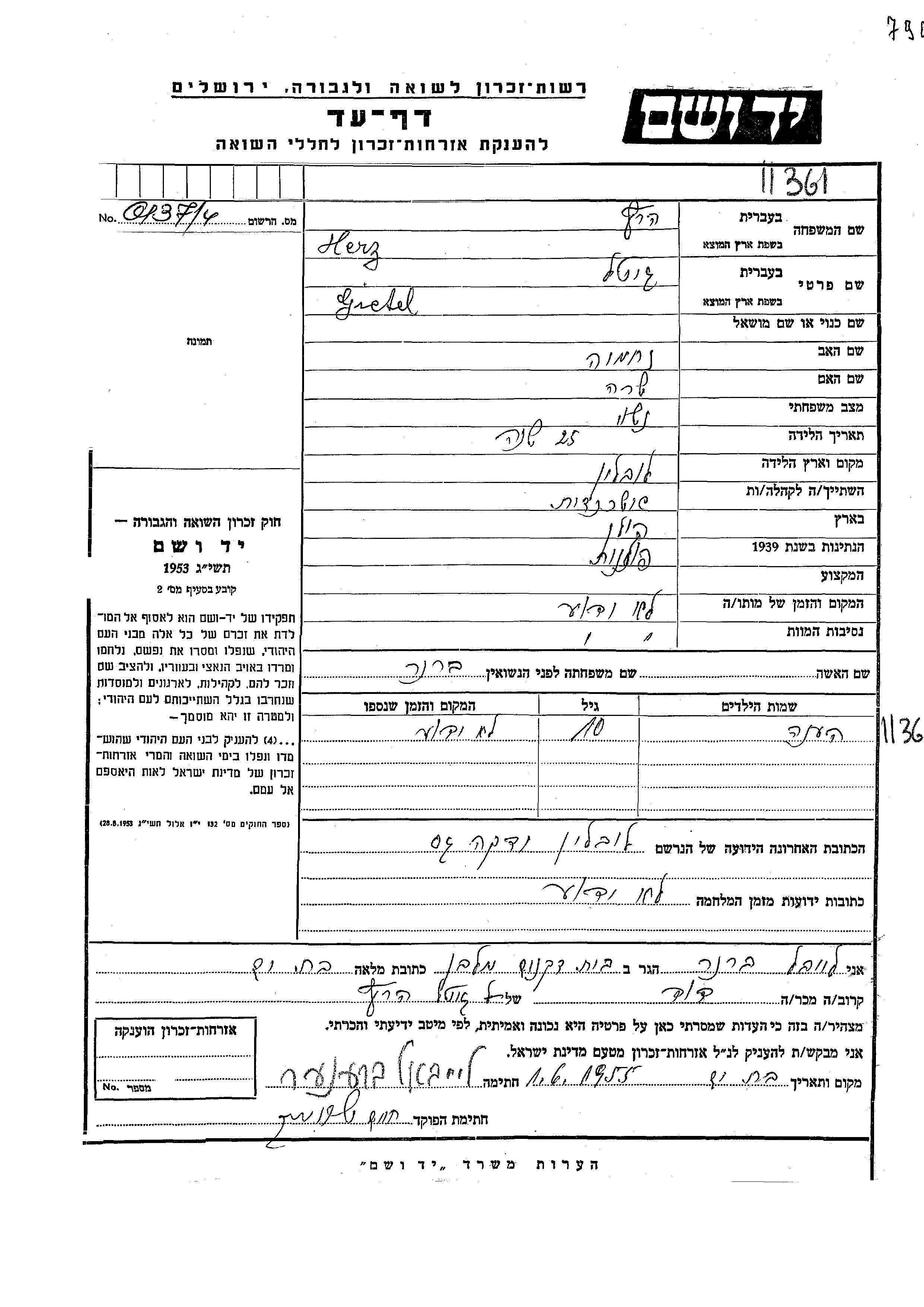 Херц Хена Люблин, Польша Лист свидетельских показаний