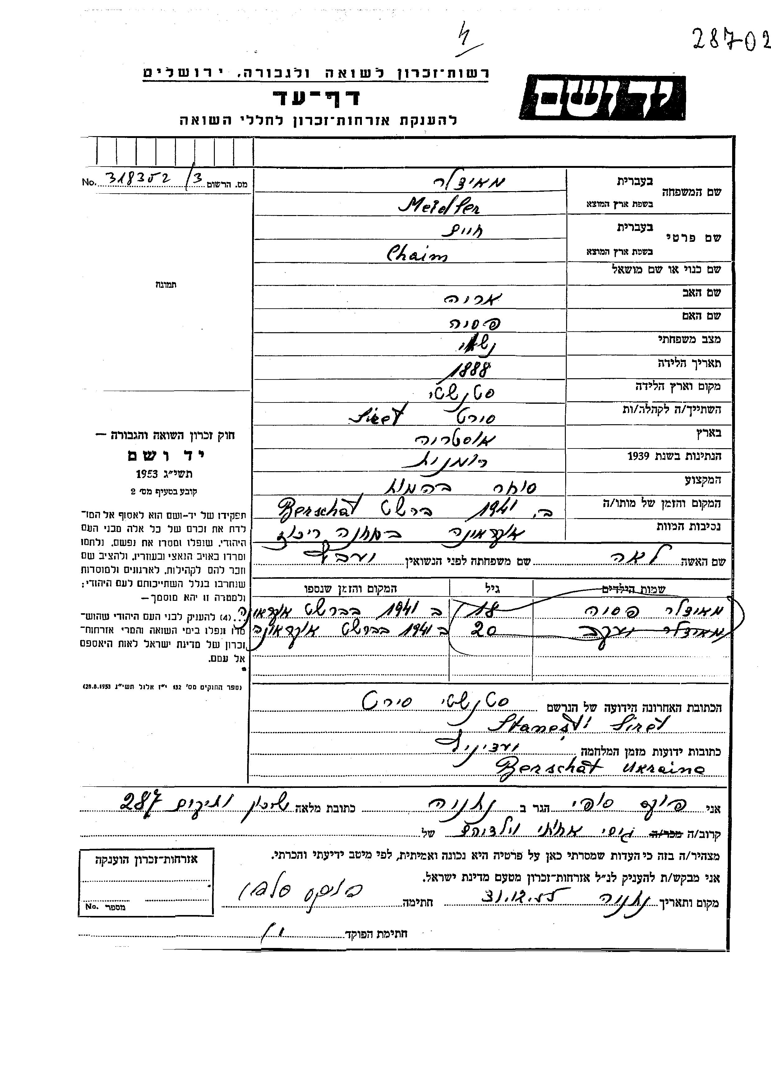 Хаим Мейдлер, место рождения: Станшти, Румыния. Отец: Арье, mать:Песя. Скотопромышленник. Женат / замужем. Место жительства до войны: Австрия. Место во время войны: Бершадь, Украина (СССР).